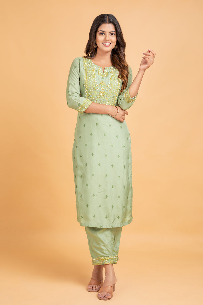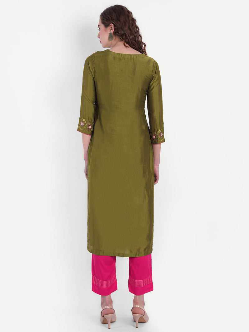 Olive Green & Pink Floral Embroidered Rayon V-Neck Kurta with Trousers