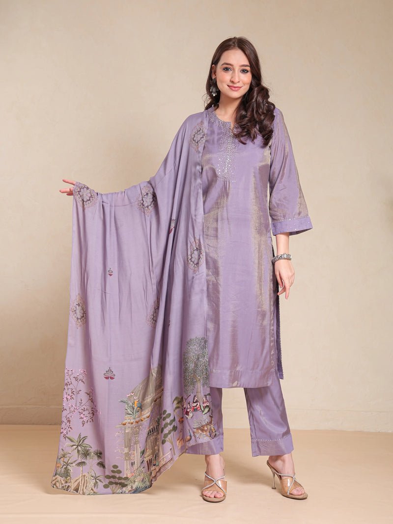 SHIMMER SILK 3PC KURTA SET WITH SEQUENCE WORK PAIRED WITH DIGITAL FLORAL PRINTED DUPATTA