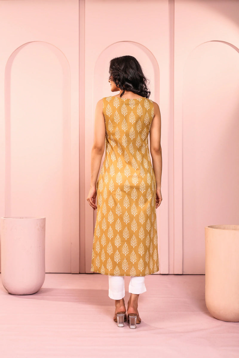 COTTON PRINTED SLEEVELESS STRAIGHT LONG KURTI