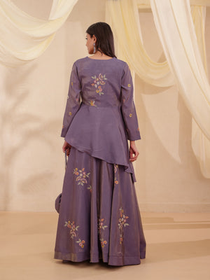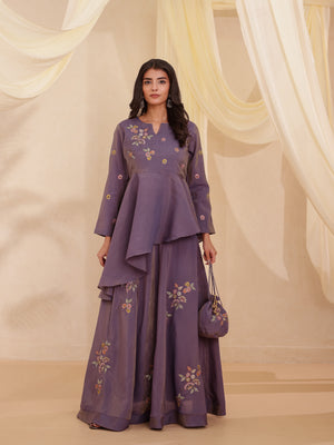 Redefine grace with this tissue elegant outfit, exquisitely adorned with floral thread and glass beads handwork that speaks of elegance. The thoughtfully crafted silhouette promises both comfort and charm. The modern contemporary set is ideal making it ideal for festive and occasion wear. The stunning half circular skirt is hand embroidered with floral motifs all over placements, the cotton lining and can-can. The top features floral hand embroidery on front and back yoke and asymmetrical short to long half circular panel to elongate the look with asymmetry silhouette top, full sleeves with embroidery all over. The 2 piece tissue set comes with hand embroidery and glass beads polti bag accessory to complete the beautiful and modern silhouette.