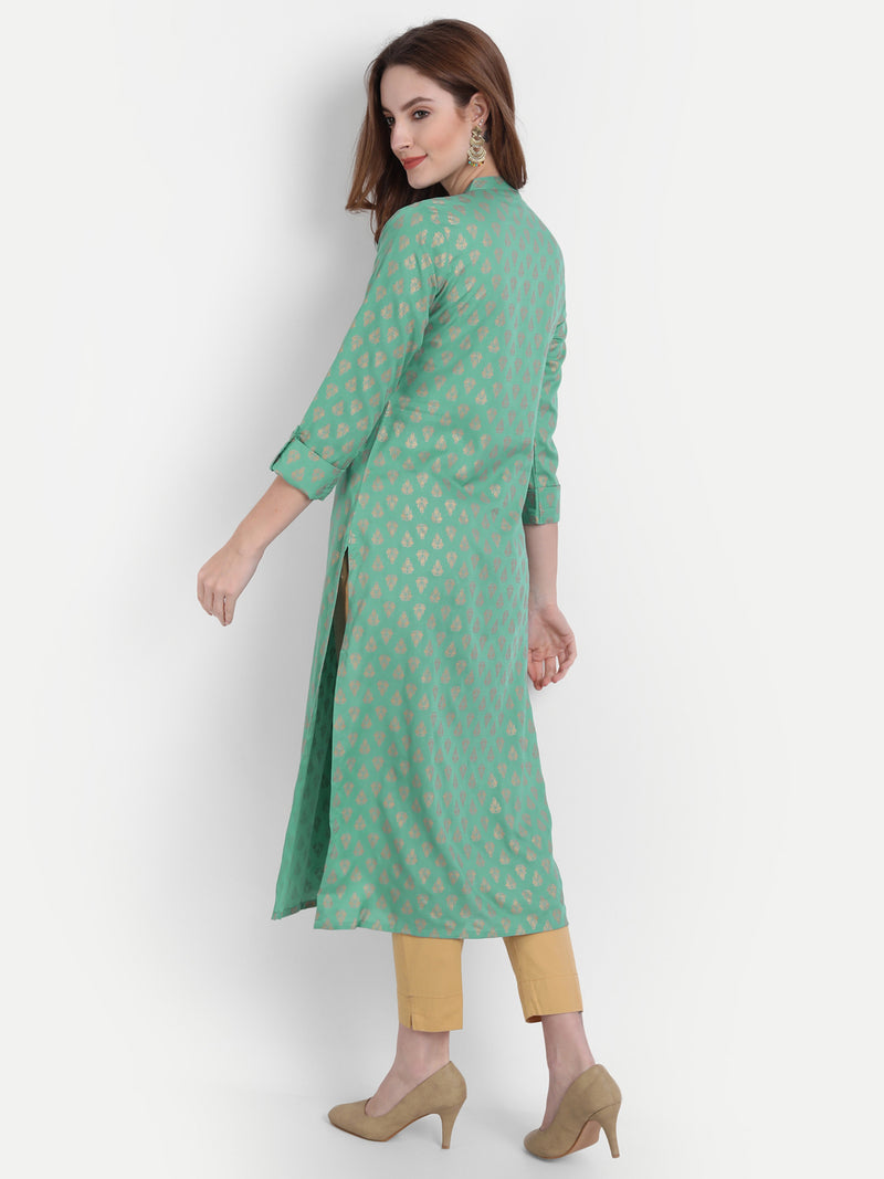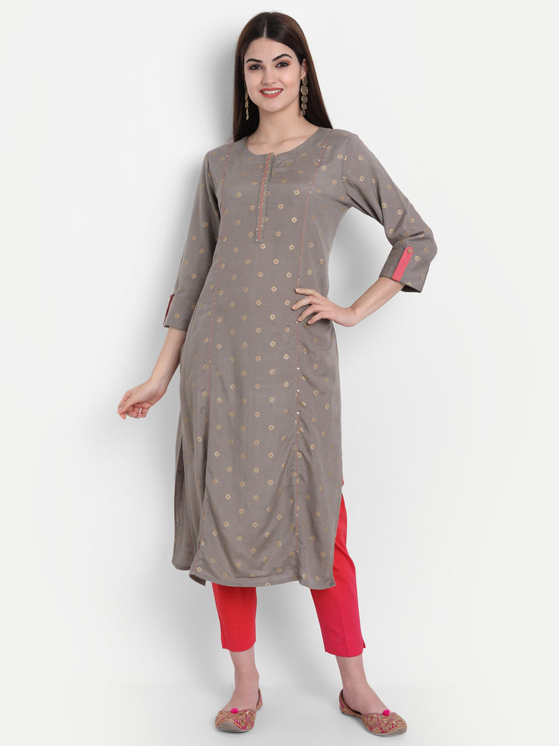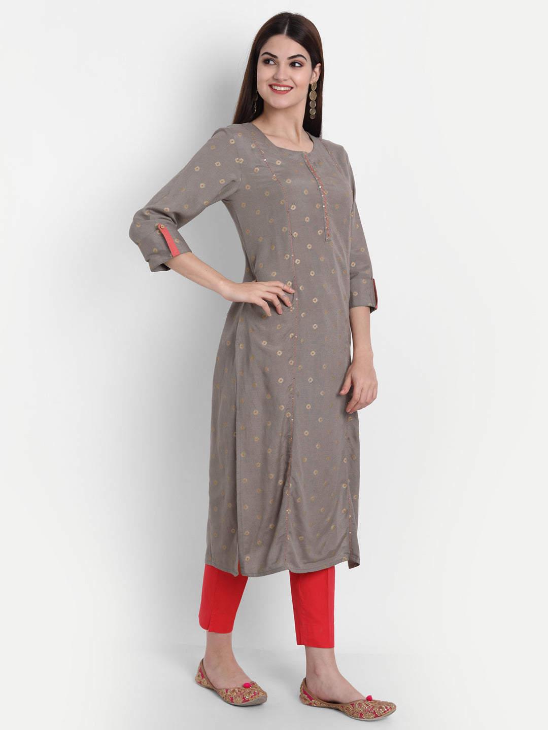 SUTI WOMEN RAYON FLEX GOLD PRINTED HAND EMBELLISHED LONG KURTA