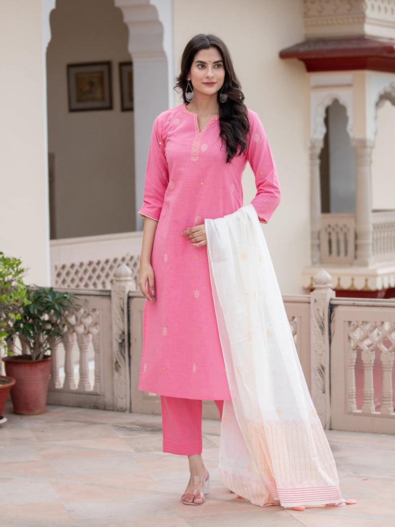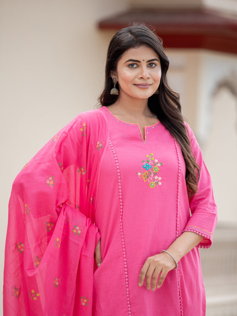 Women Brink Pink 3PC MIRROR WORK EMBROIDERED KURTA PANT SET