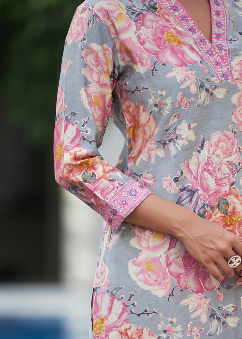 Women English Gray Floral Printed Co-ord Set with Embroidery Detail