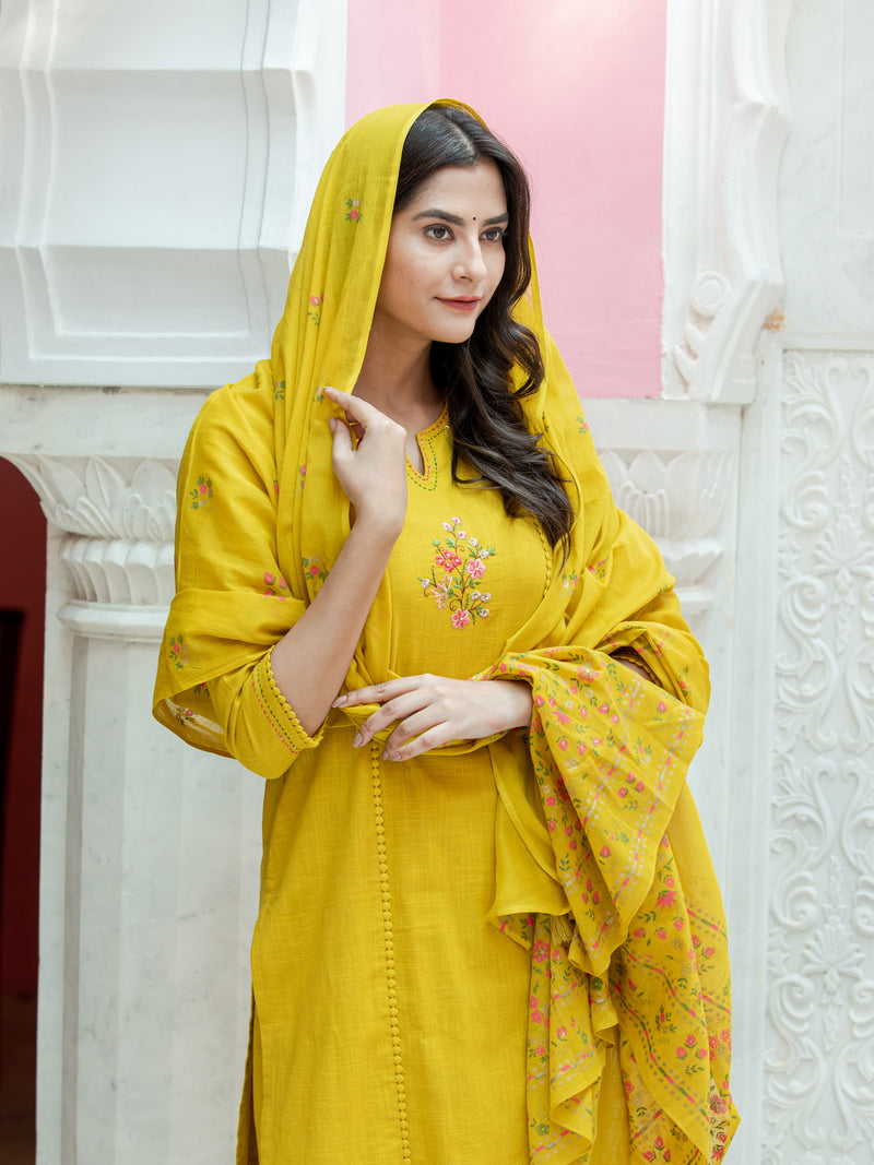 Women Ceylon Yellow 3PC KURTA PANT SET EMBROIDERED WITH HAND CRAFT DETAILS