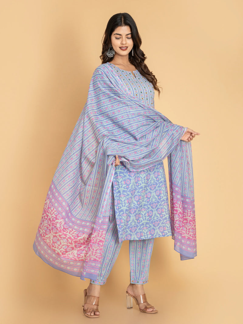 Women Dusk Blue MUL-COTTON 3PC PRINTED KUTI PANT SET WITH EMBROIDERY DETAILS