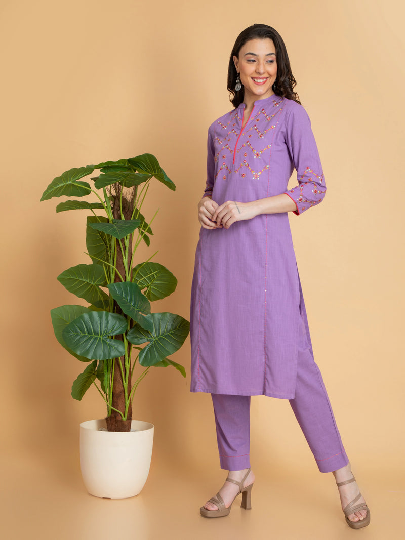 Women Lavender MIRROR EMBROIDERY 2PC KURTA PANT SET DETAILED WITH KANTHA WORK.