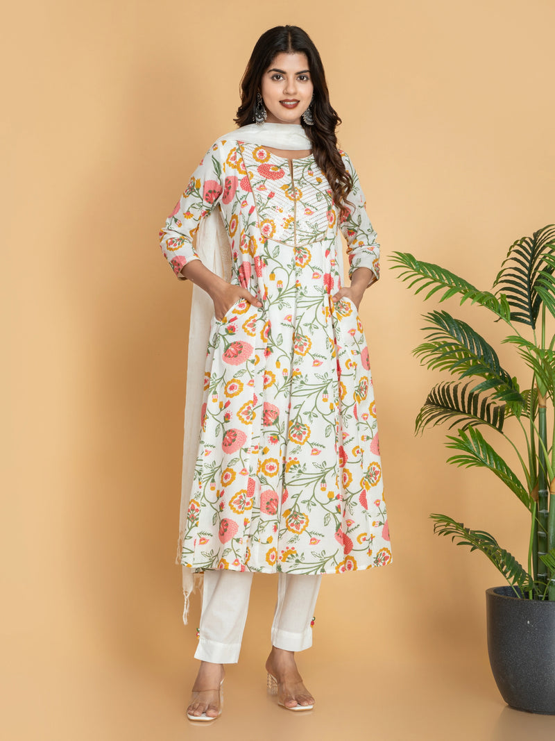 Women Off White MUL-COTTON PRINTED ANARKALI 3PCS SET