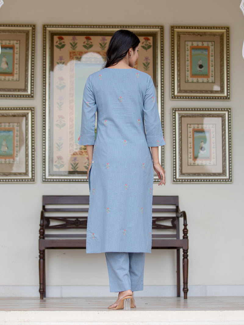 Women Powder Blue 2PC KURTA PANT SET WITH HAND CRAFT DETAILS