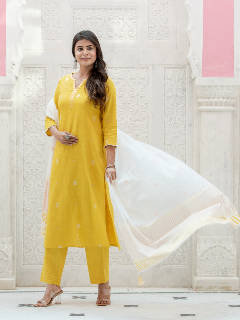 Women New Mustard 3PC MIRROR WORK EMBROIDERED KURTA PANT SET