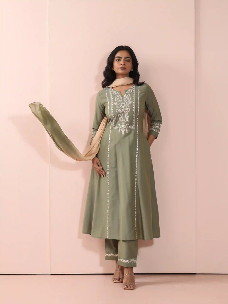 Women Green mirror-embroidered-3pc-flaired-kurta-set-paired-with-chifon-ombrey-dupatta