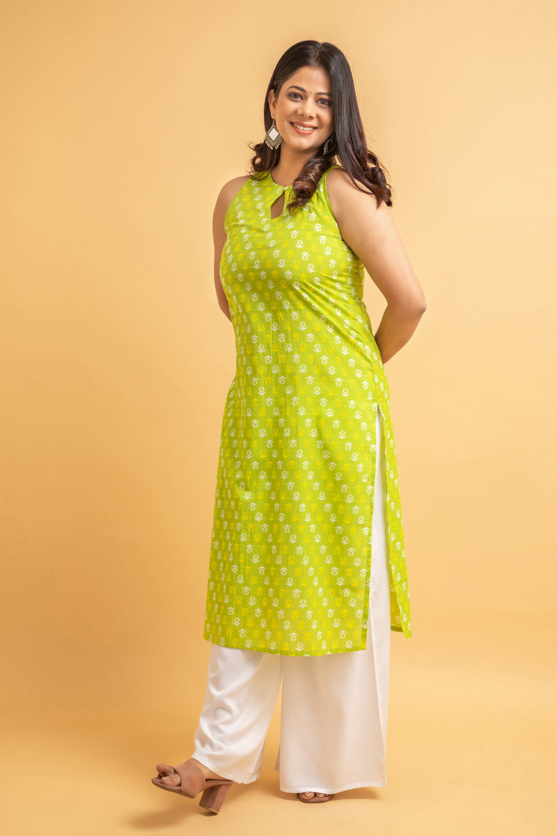 A Line Printed Long Kurti With Fancy Button On Front Placket