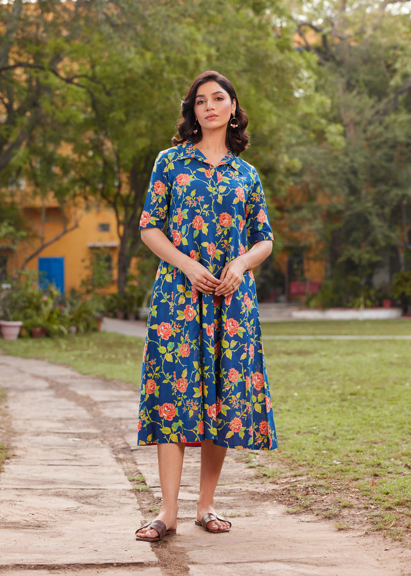 Mul Cotton Floral Print Flared Long Dress