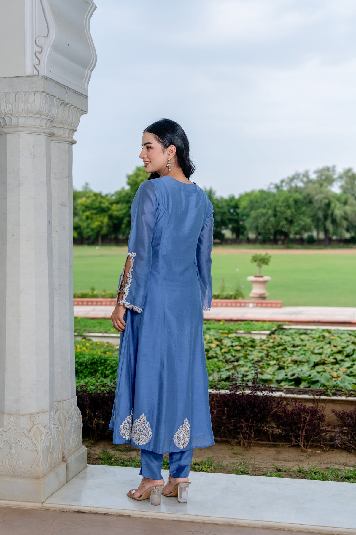 3 pcs embroidered flaired kurta set with hand adda work .