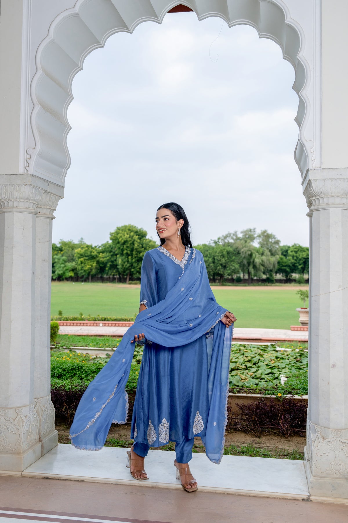 This graceful MUSLIN outfit captures the essence of ethnic charm . designed with intricate cutwork detailing on sleeves and dupatta, embellished with ADDA WORK . This piece brings together beauty and comfort. Whether worn for a celebration or a special outing, it adds a sense of timeless sophistication to your look.