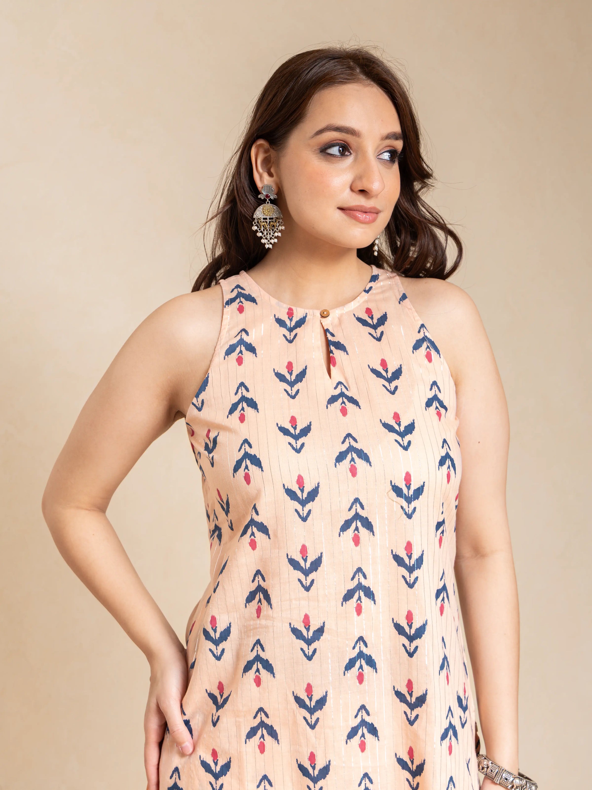 Redefine grace with this MUL COTTON W/ SILVER LUREX SLV LESS PALAZZO KURTI SET, exquisitely adorned with slv less palazzo kurti set that speaks of elegance. The thoughtfully crafted silhouette promises both comfort and charm, making it ideal for festive and casual outings. Pair this stunning piece with statement accessories for a complete and polished look that resonates with modern tradition. Style this elegant piece with your favorite accessories to complete the perfect look.