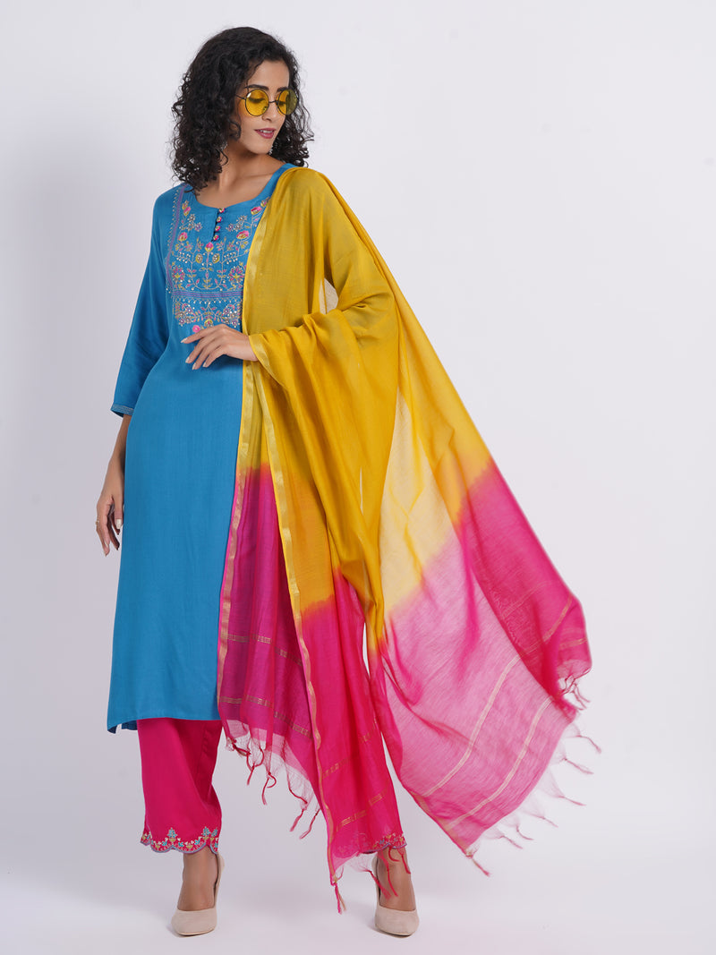 Cotton 3pc Kurta Pant Dupatta Set with Scalloping Embroidery