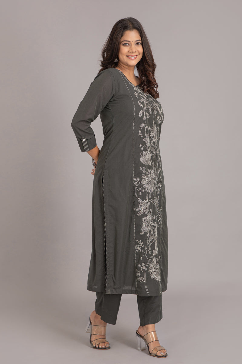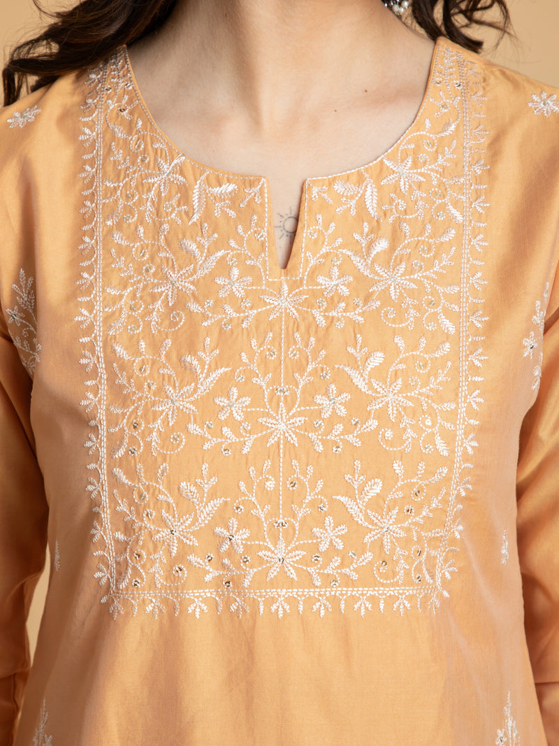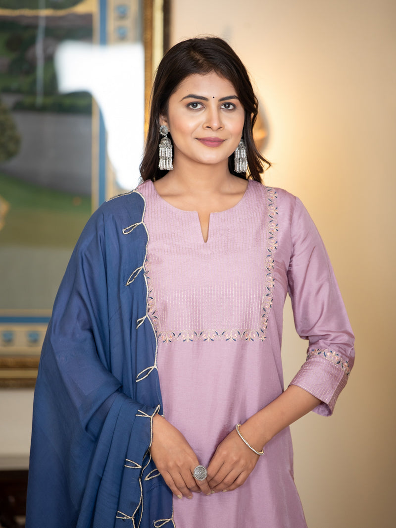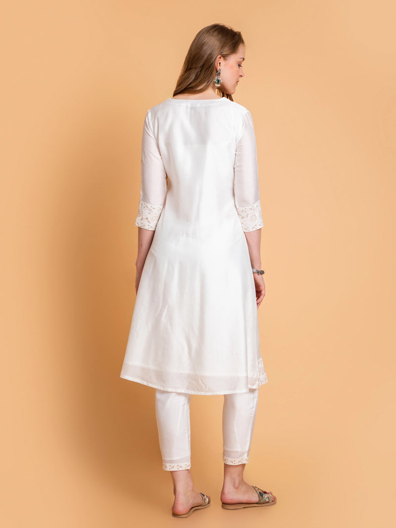 CHANDERI 3PC KURTA PANT SET WITH DELICATE EMBROIDERY DETAILS