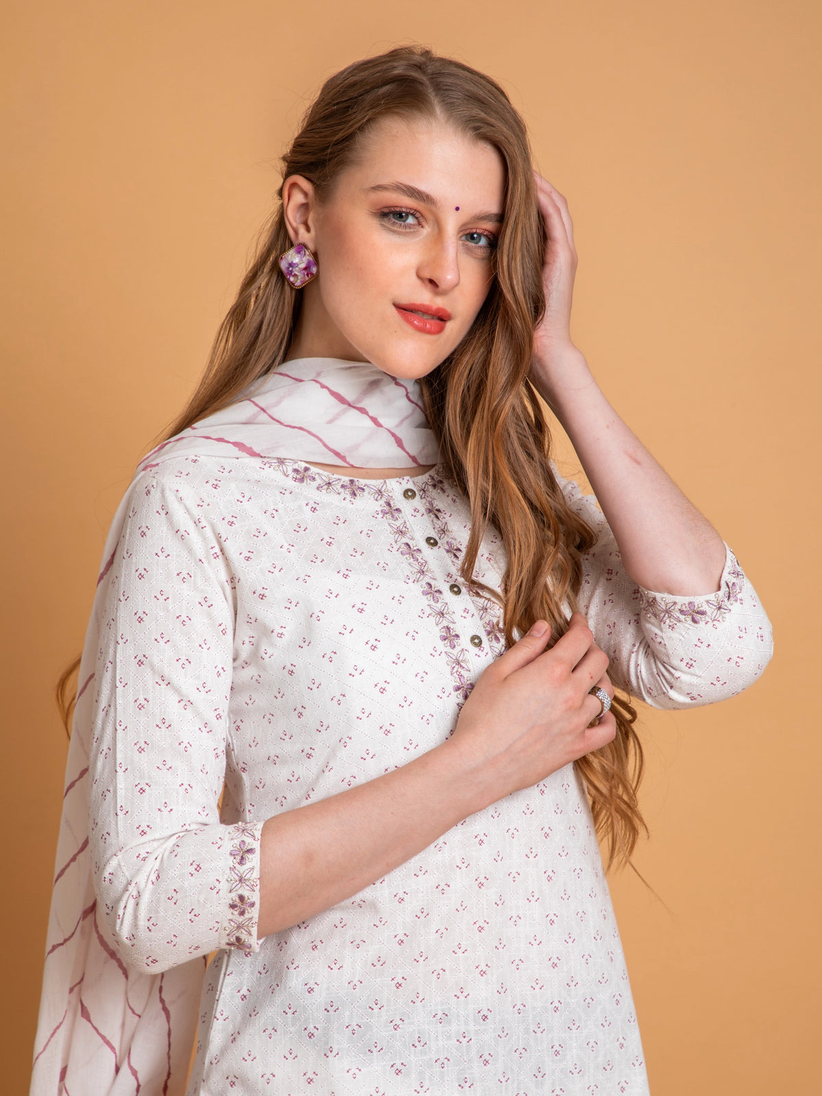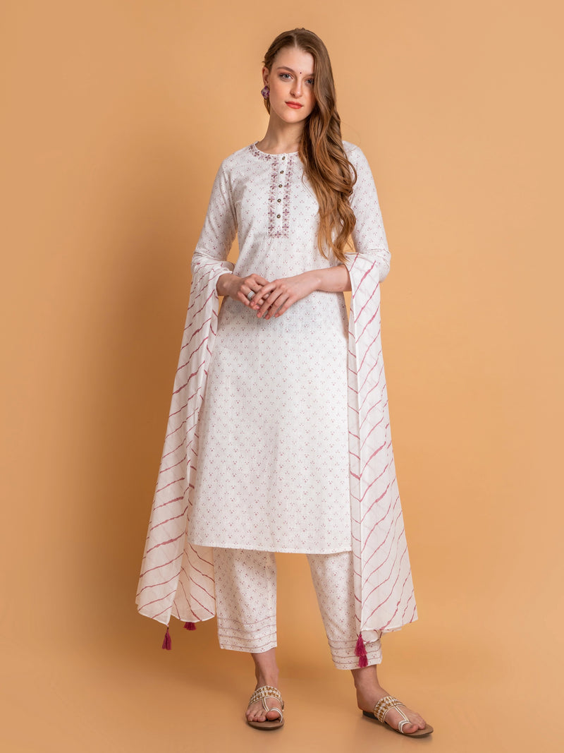 Mul Cotton Khadi Print 3 Pc Kurta Pant Set With Lace Details
