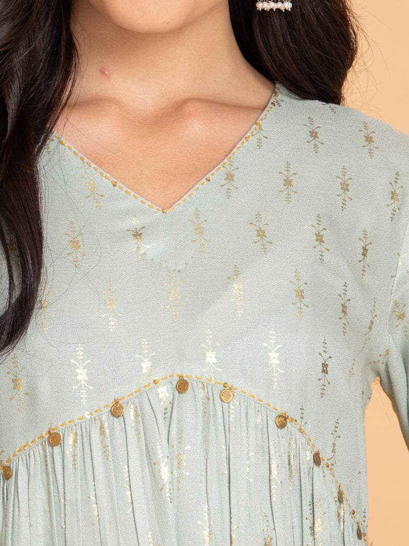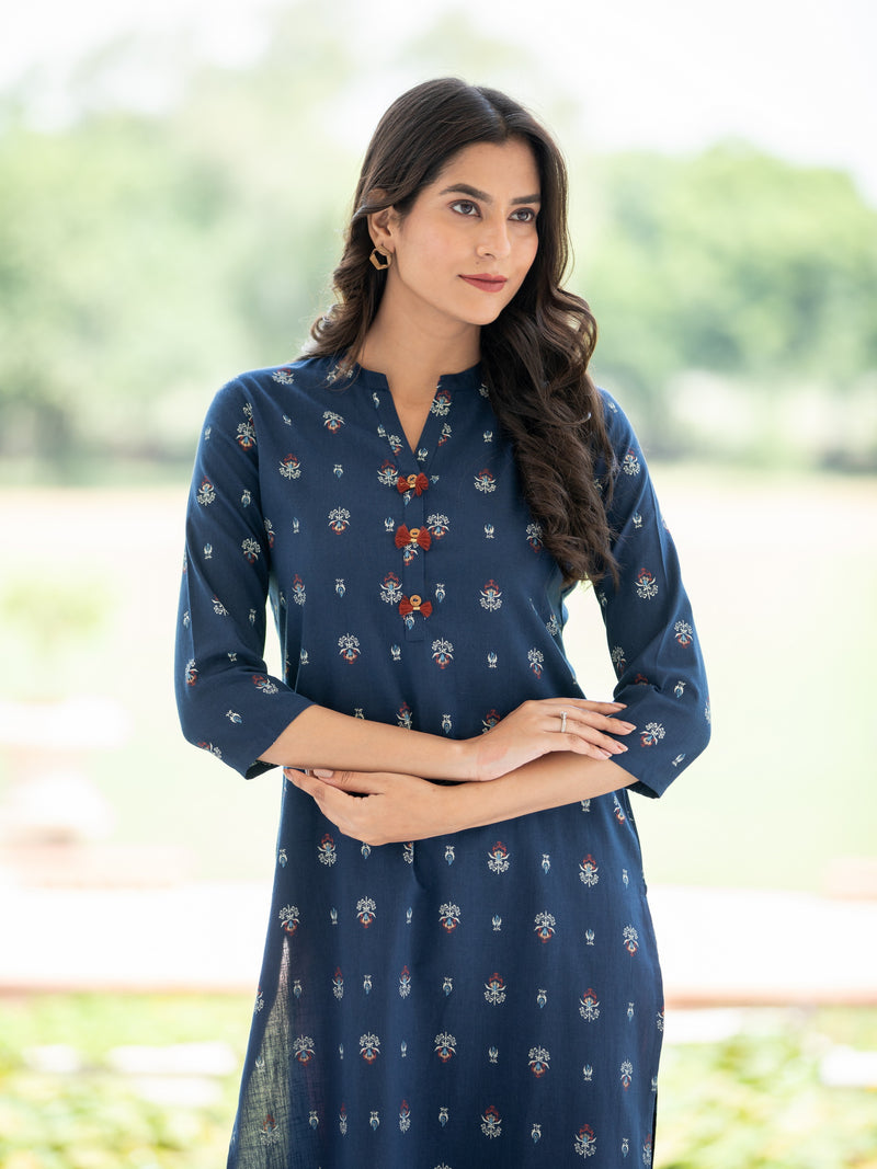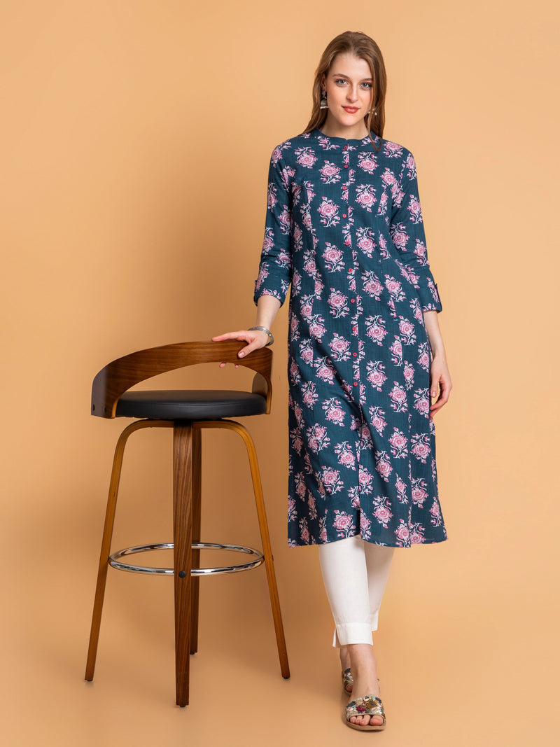 FLORAL PRINTED A-LINE KURTI EMBELLISHED WITH BUTTON DETAILS
