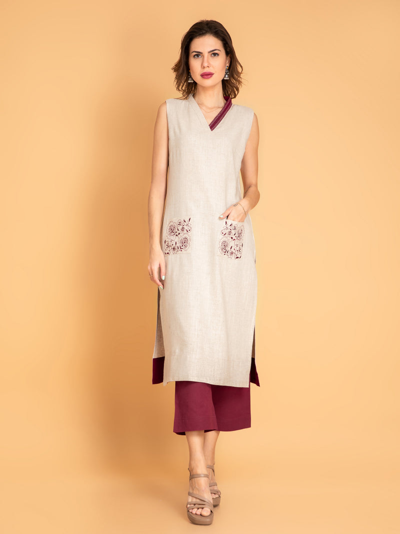 Suti Women Rayon Linen Long Sleeveless Kurti With Crafted Pocket