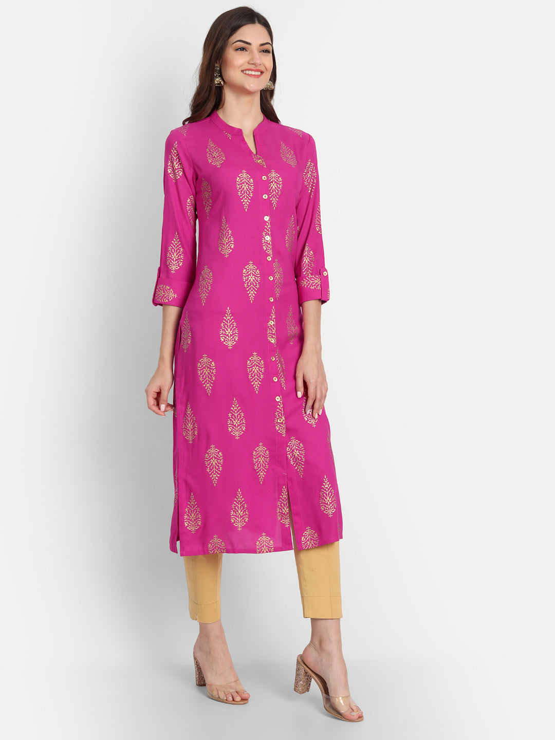 Rayon Gold Printed Long Kurti With Beautiful Neck Line