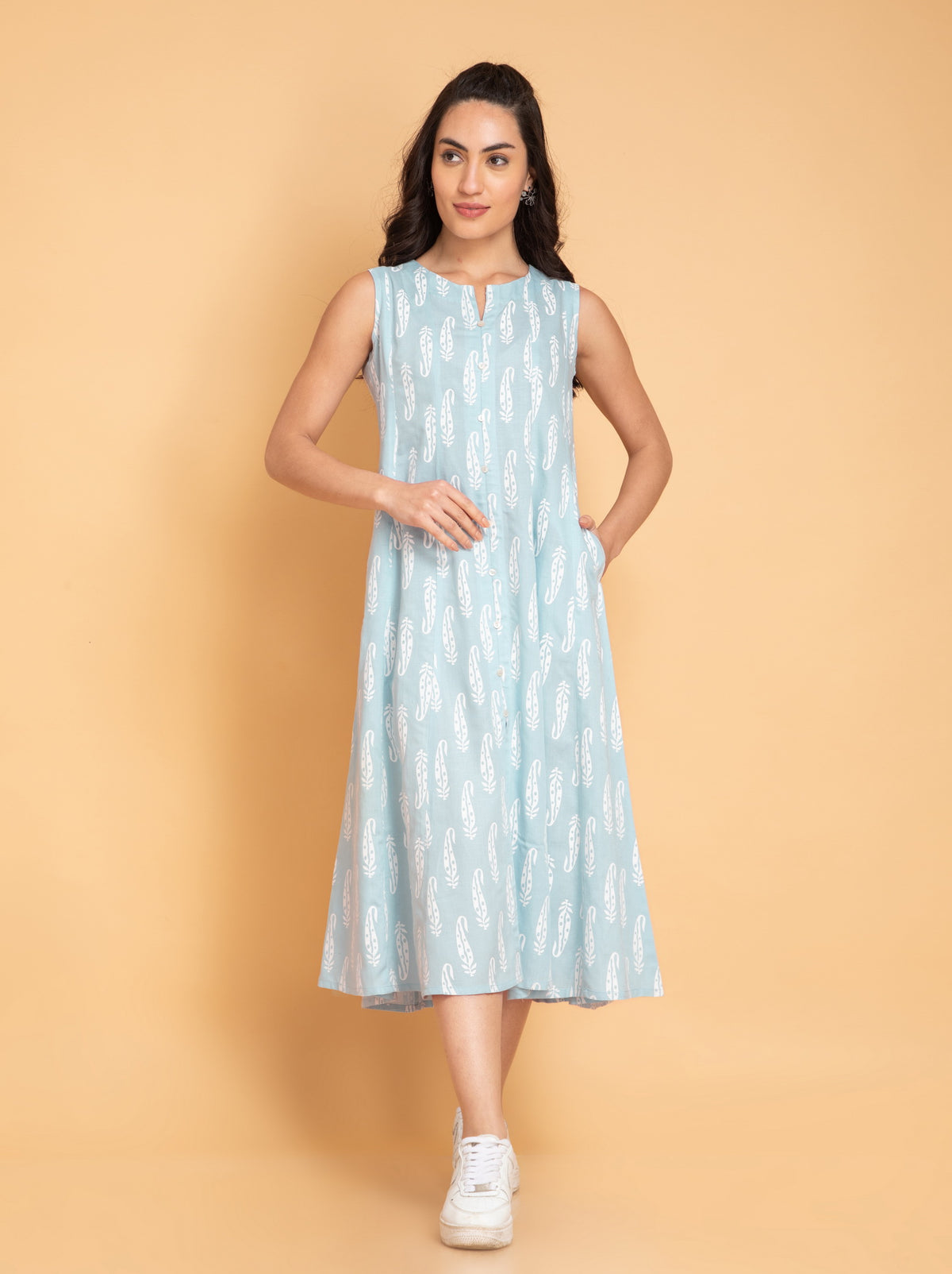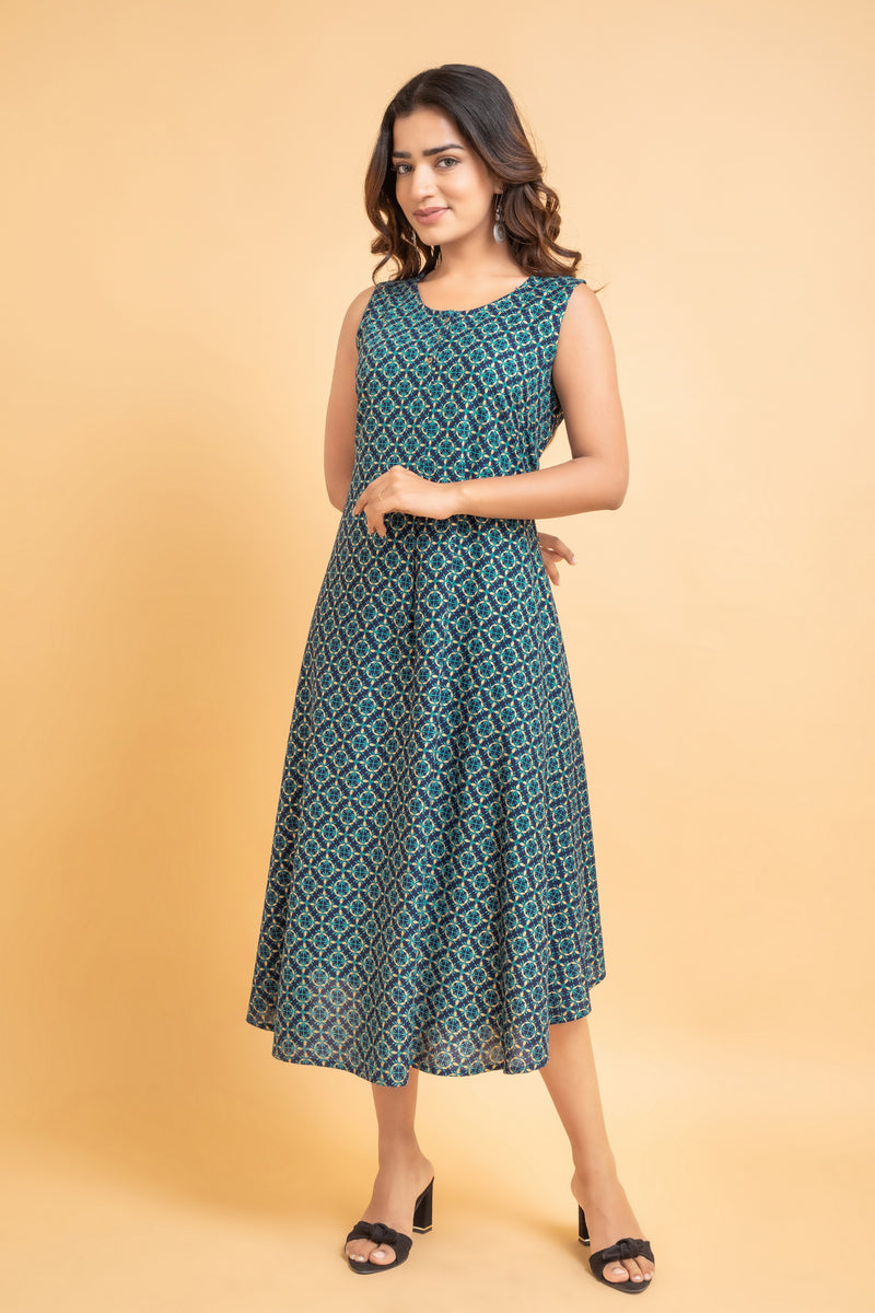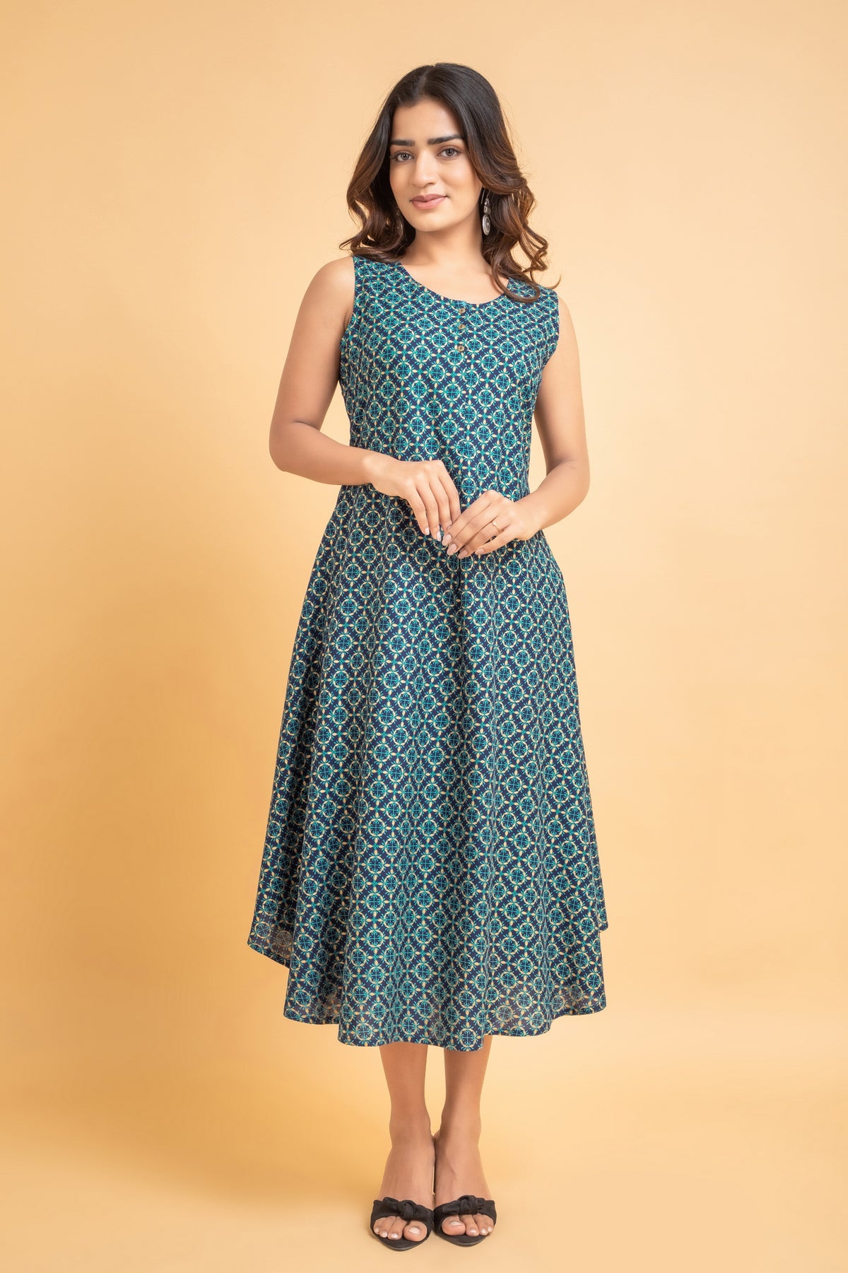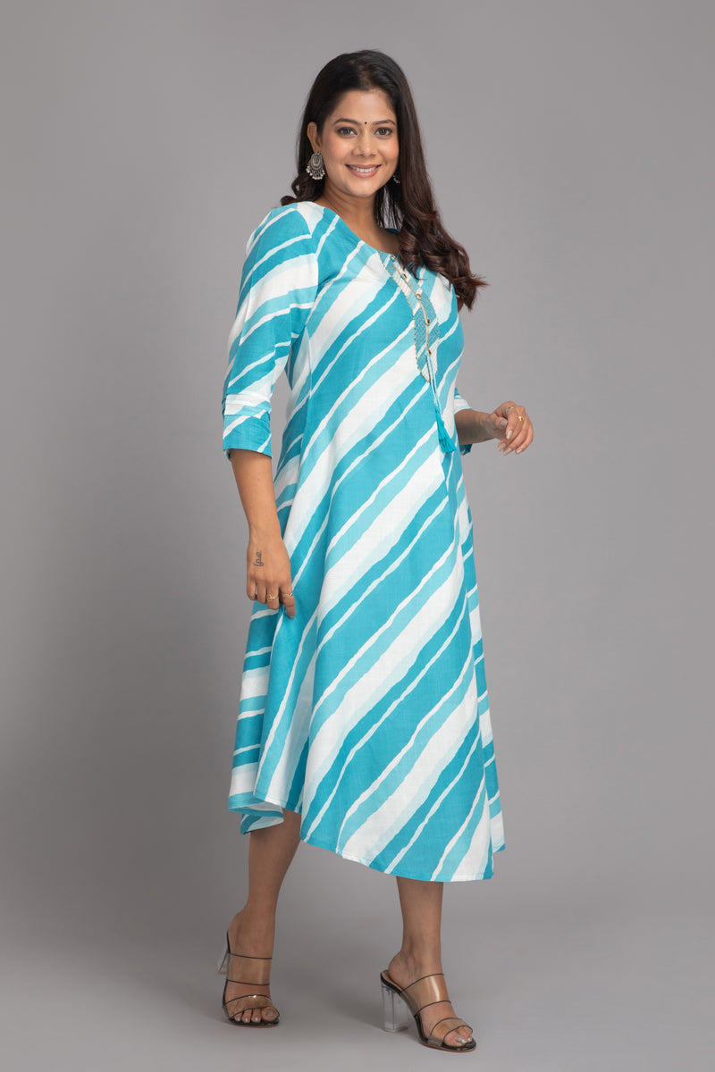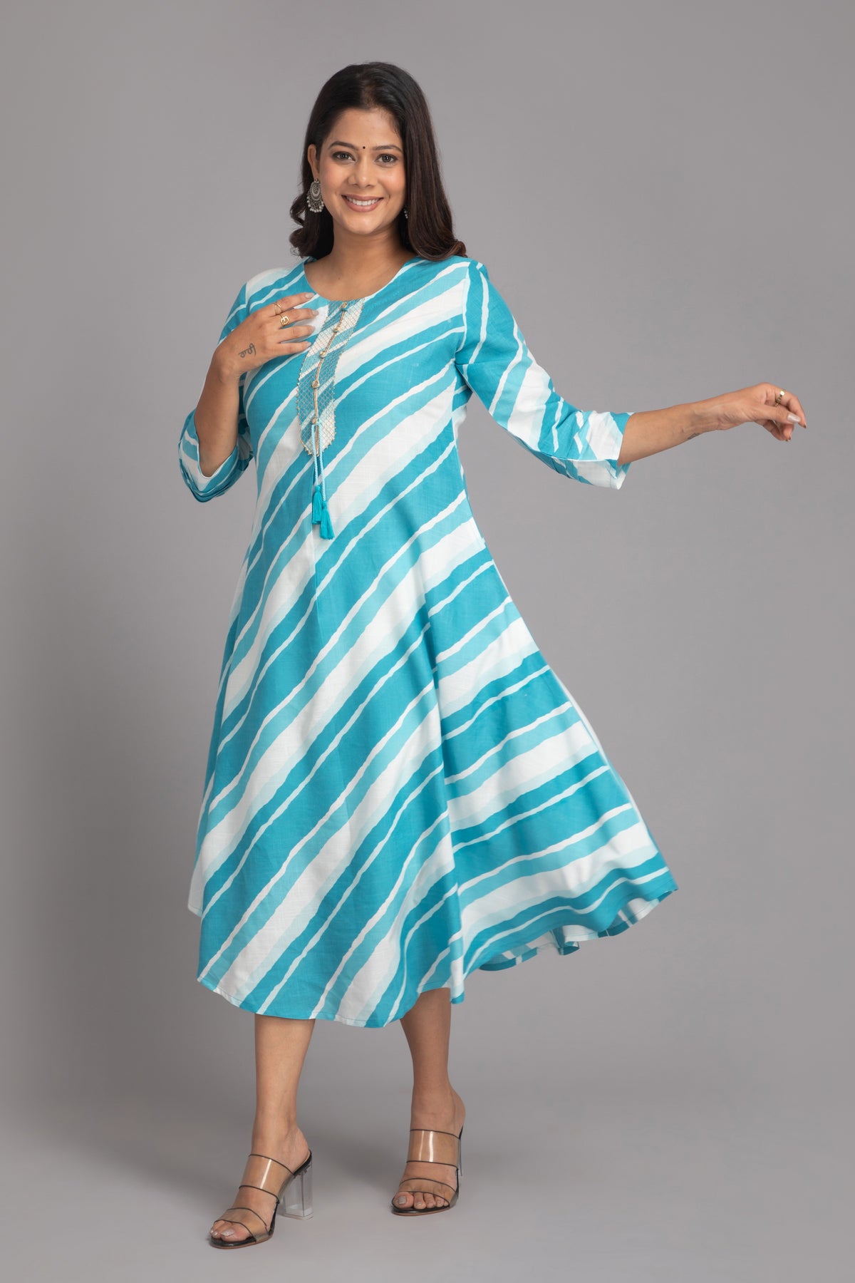 Lehariya Print Flared Kurti Dress with Hand Embellished Zari Placket