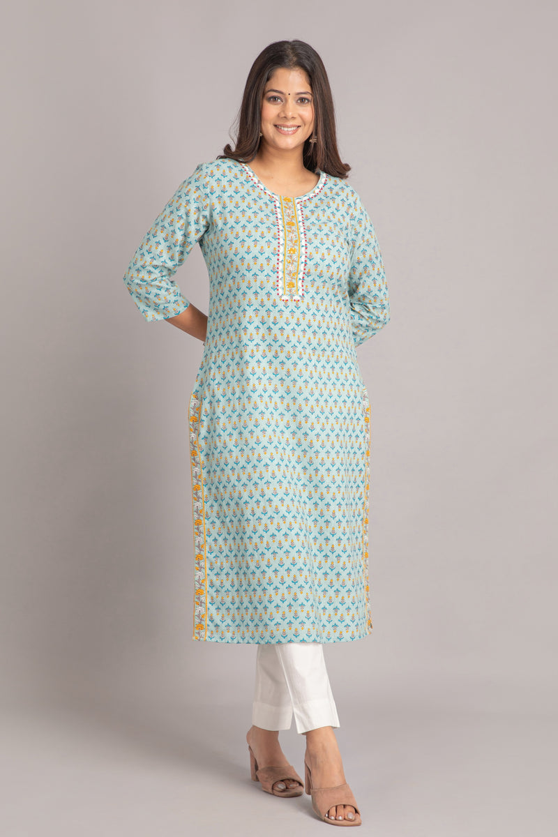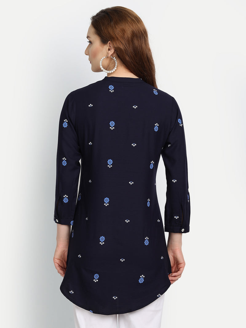 Rayon Linen Printed Boat Neck Kurti with Handwork Details