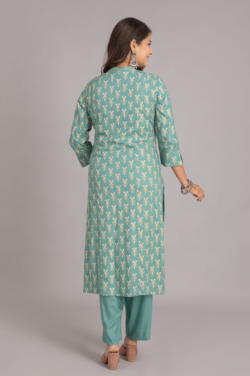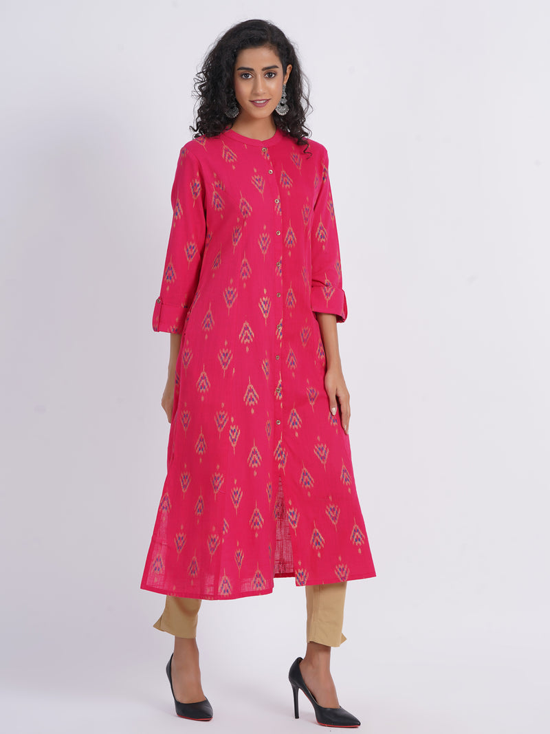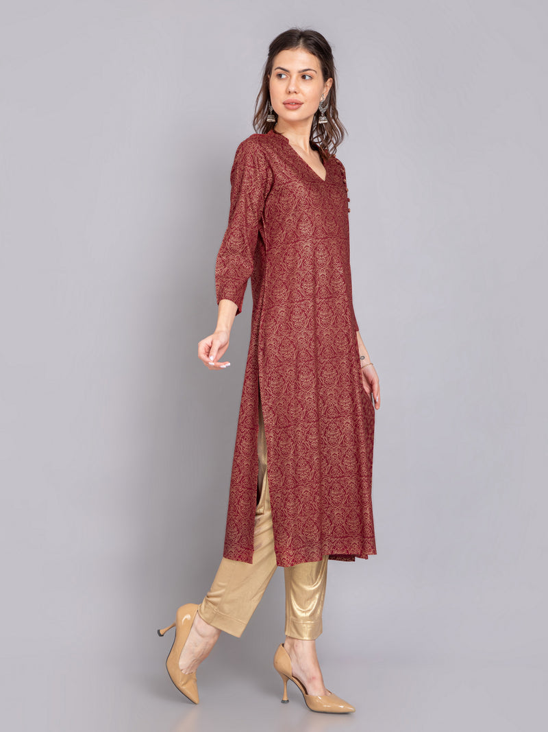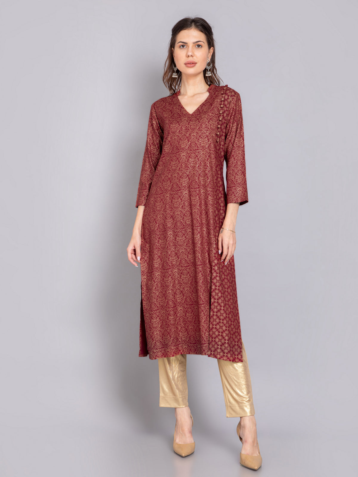 GOLD PRINTED FESTIVE LOOK KURTI EMBELLISHED WITH CRAFT BUTTONS