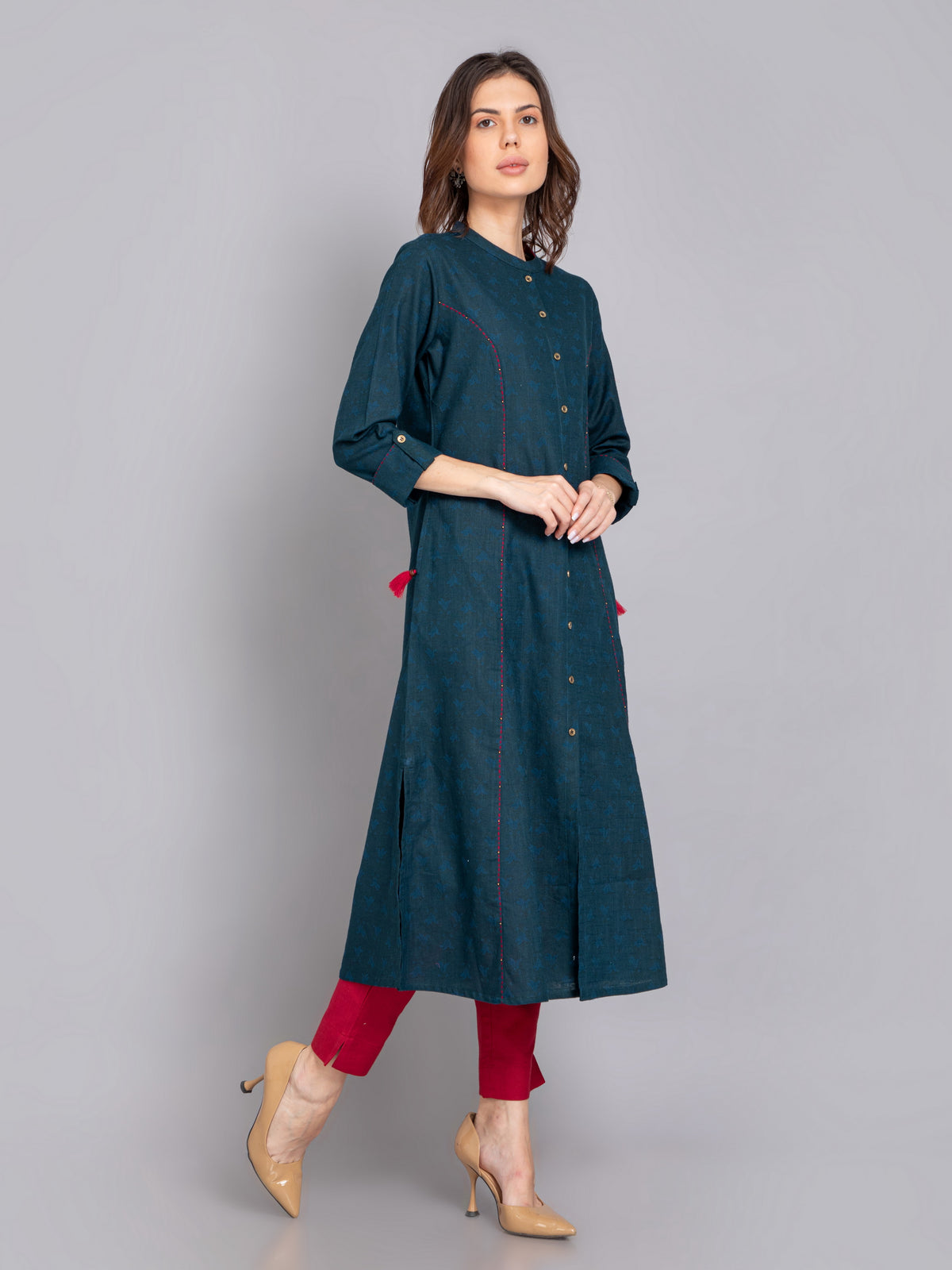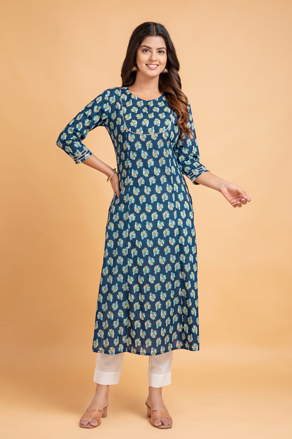 Floral A-Line Long Kurti with Craft Buttons & Lace Work