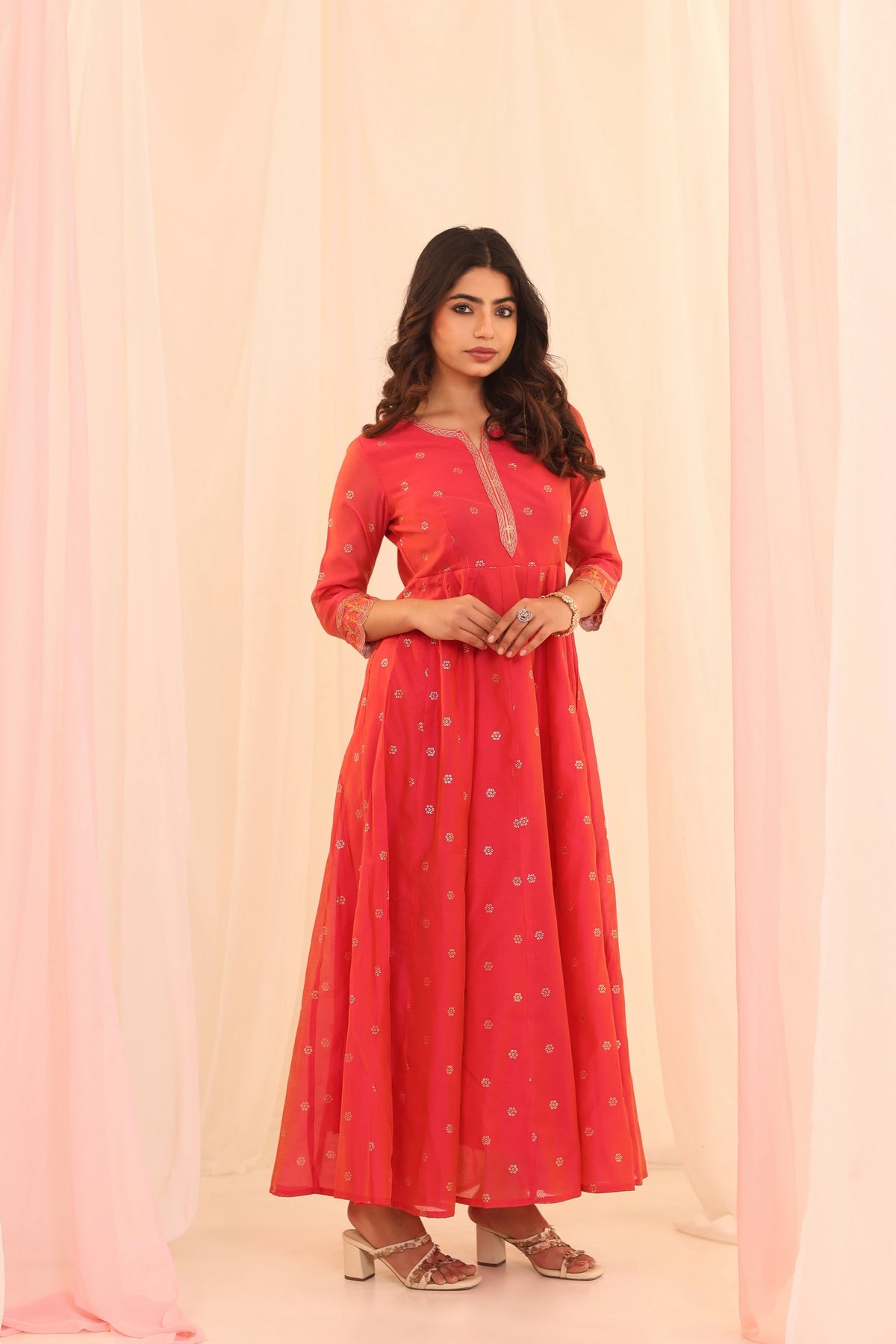 CHANDERI SILK EMBOSSED PRINTED KALIDAR DRESS WITH EMBROIDERY DETAIL