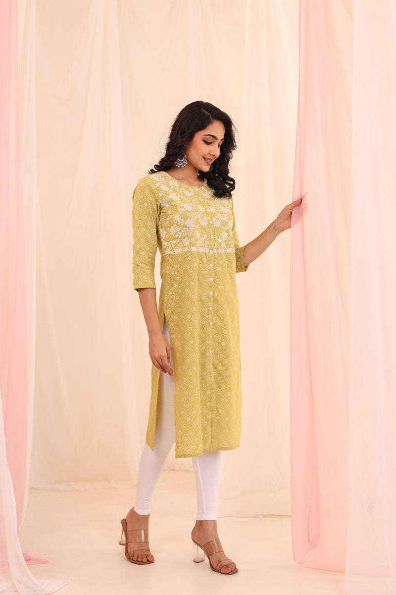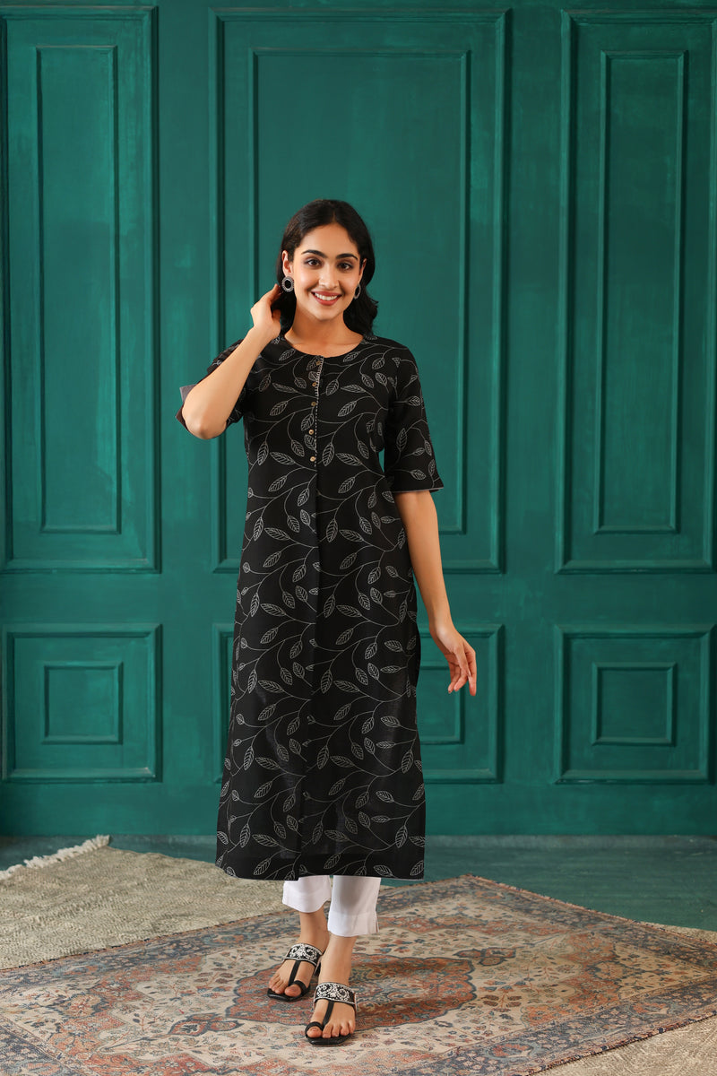 LINEN BLEND KHADI PRINTED KURTI EMBELLISHED WITH HAND CRAFT DETAILS