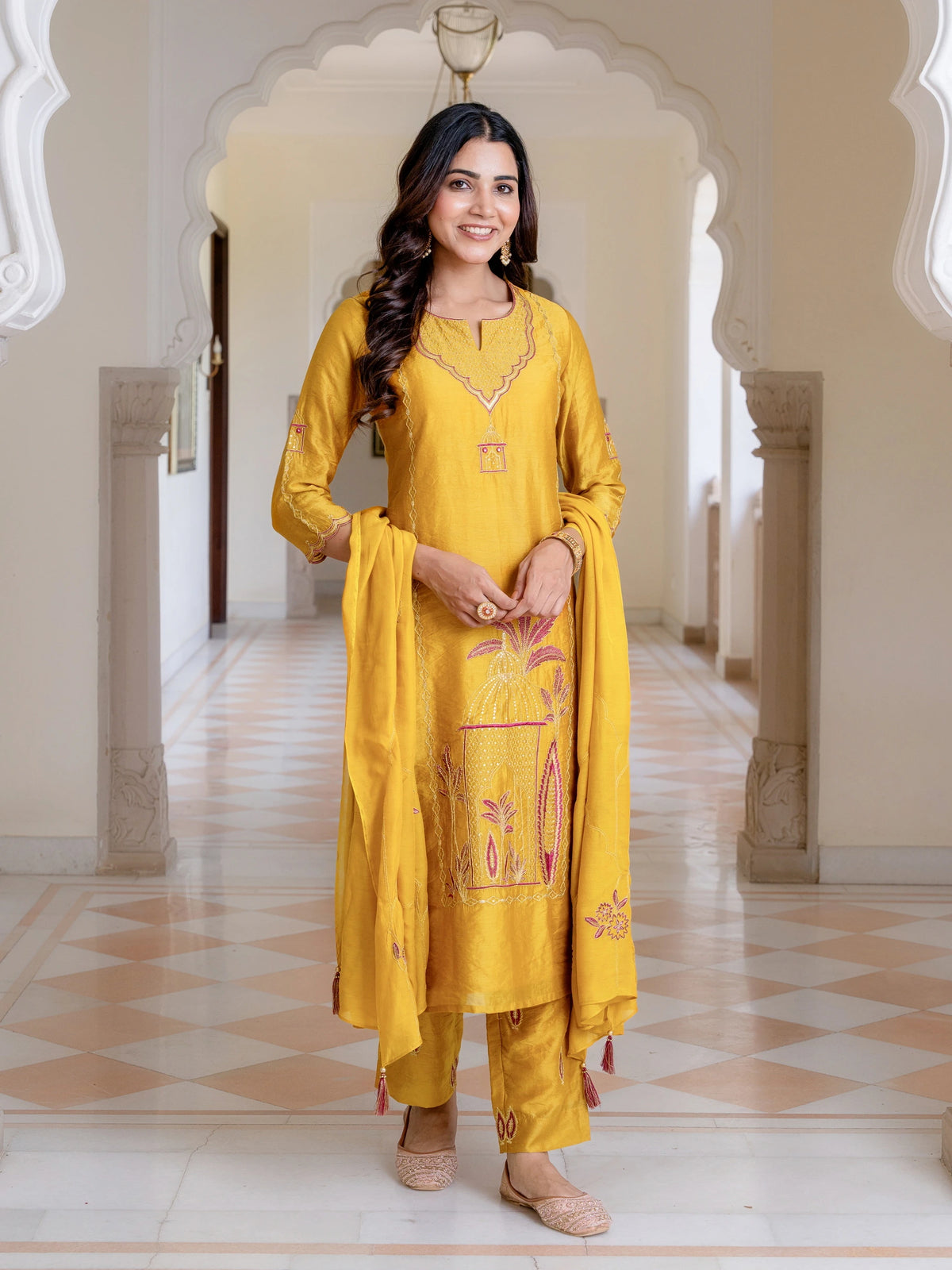 RICH SILK 3PC SET EMBELLISHED WITH PLACEMENT EMBROIDERY & ADDA WORK DETAILS