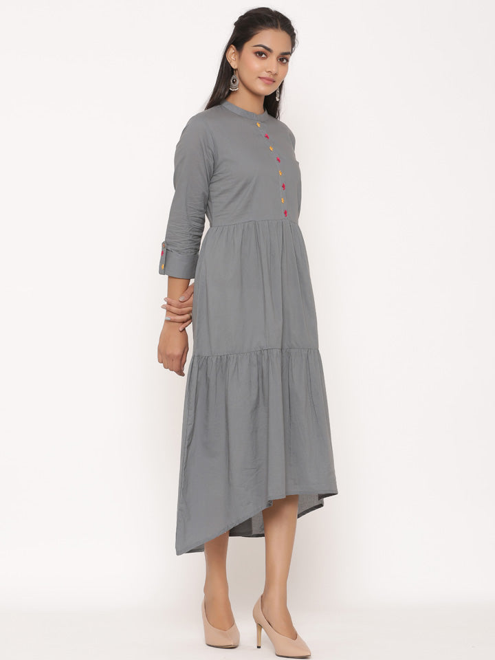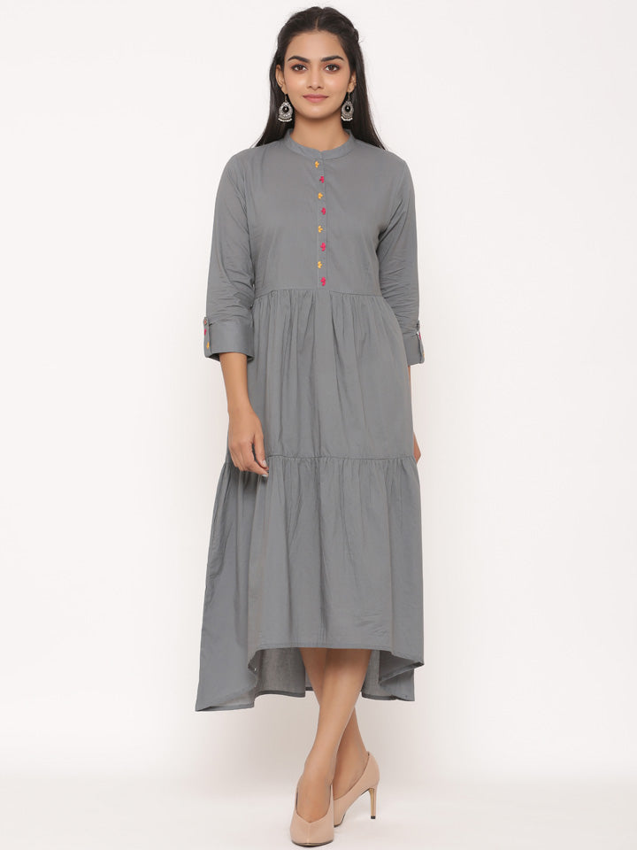 SUTI WOMEN MUL COTTON TIERED FLARED LONG DRESS WITH HAND CRAFT