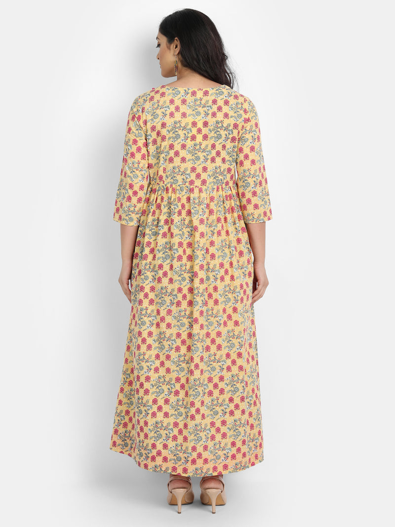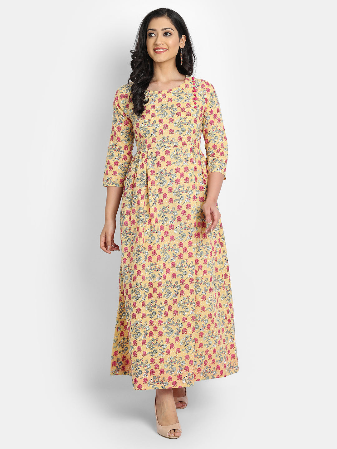 COTTON FLORAL PRINTED LONG DRESS WITH SEQUENCE AND BUTTON WORK