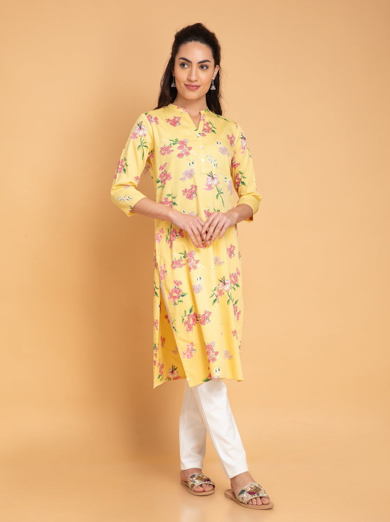 SUTI WOMEN COTTON LEMON YELLOW PRINTED STAND COLLER PLACKET KURTA