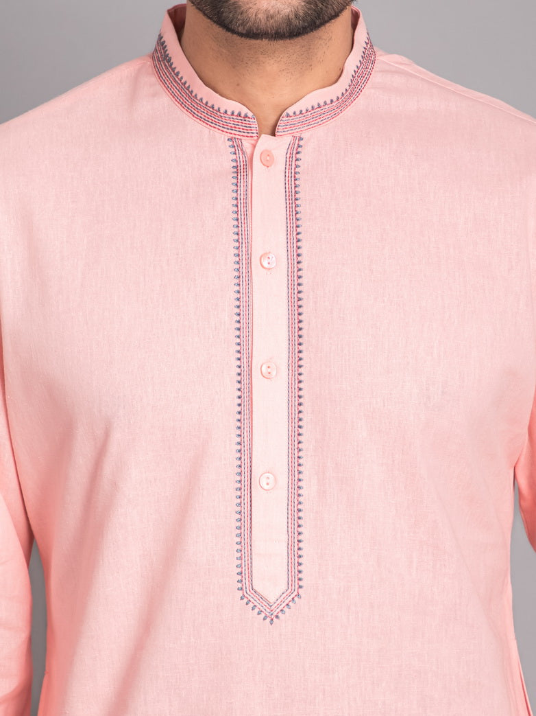 Suti Mens Pink Cotton Linen Neckline Embroidered Regular Fit Long Kurta