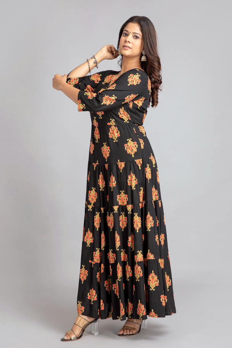 LONG TIERED PRINTED FUSSION DRESS HAND EMBELISHED SEQ