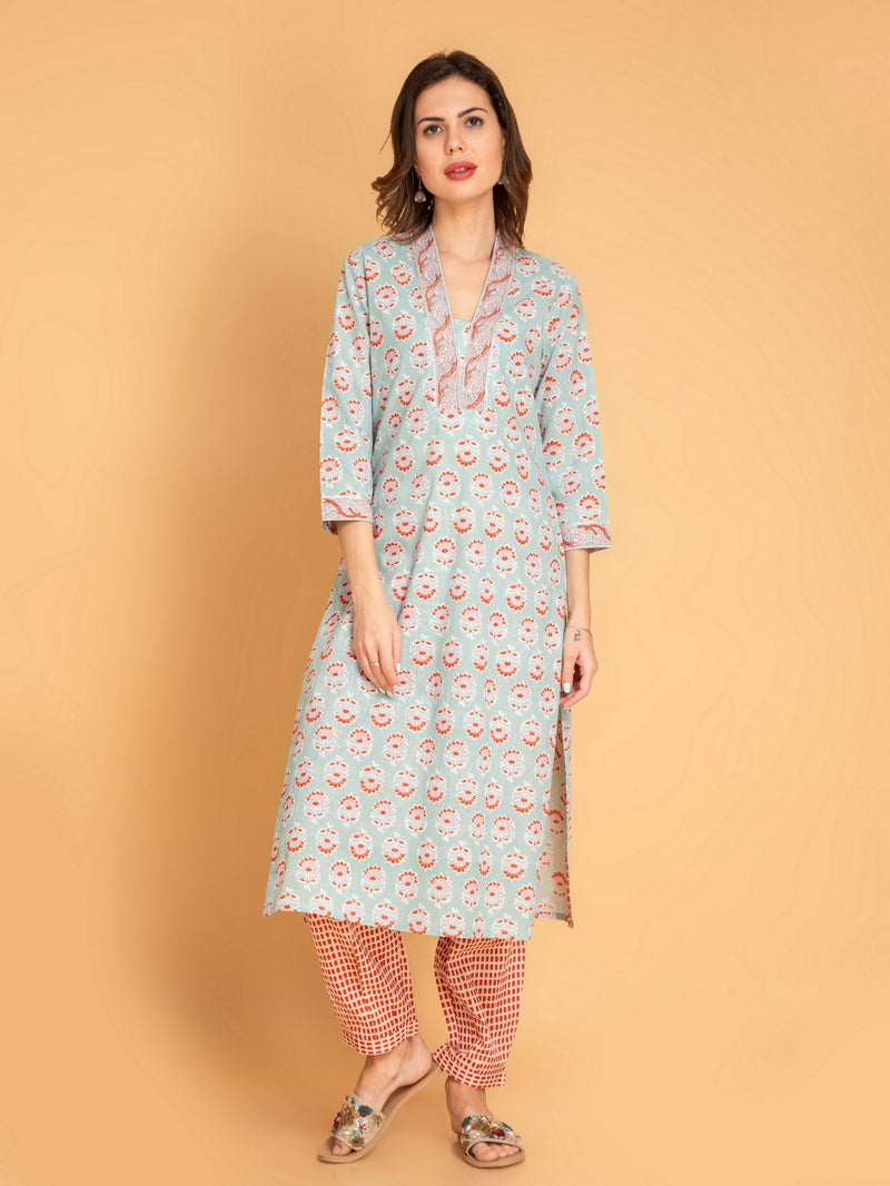 Mul-Cotton 2PC Printed Kurta Pant Set with Lace & Zari Work
