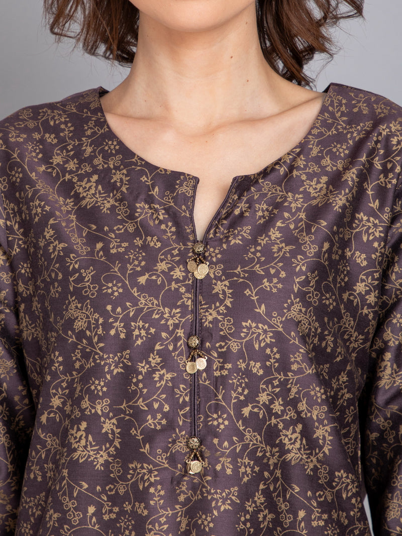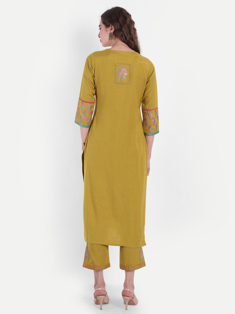 Rayon Linen Gold Printed Embroidered Kurta & Pant Set