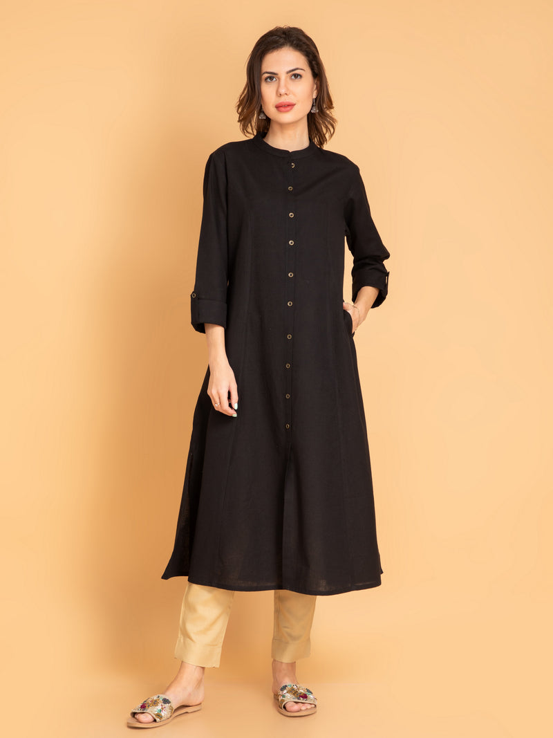 Linen Blend A-Line Long Kurta with Metal Buttons