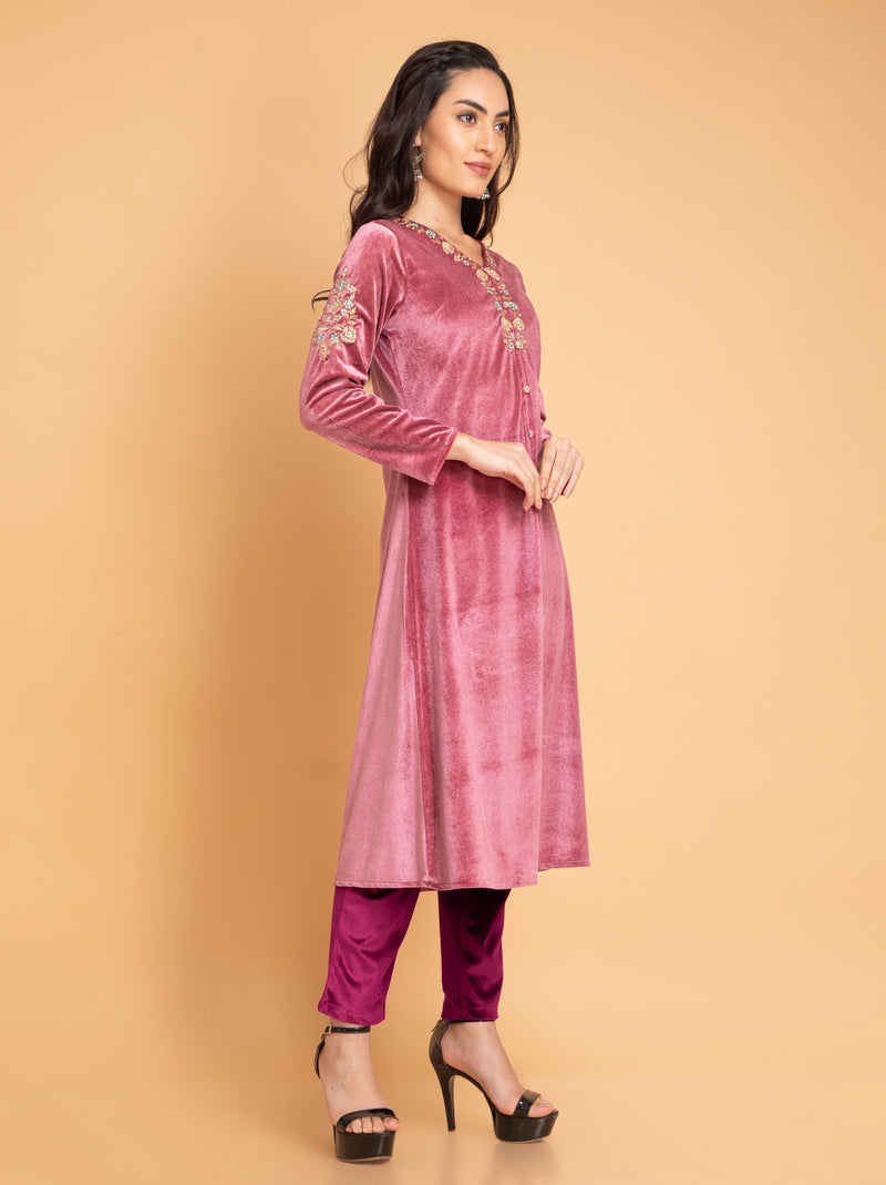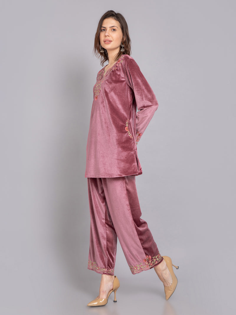 VELVET CO-ORD SET EMBELLISHED WITH EMB. & HAND DETAILS.