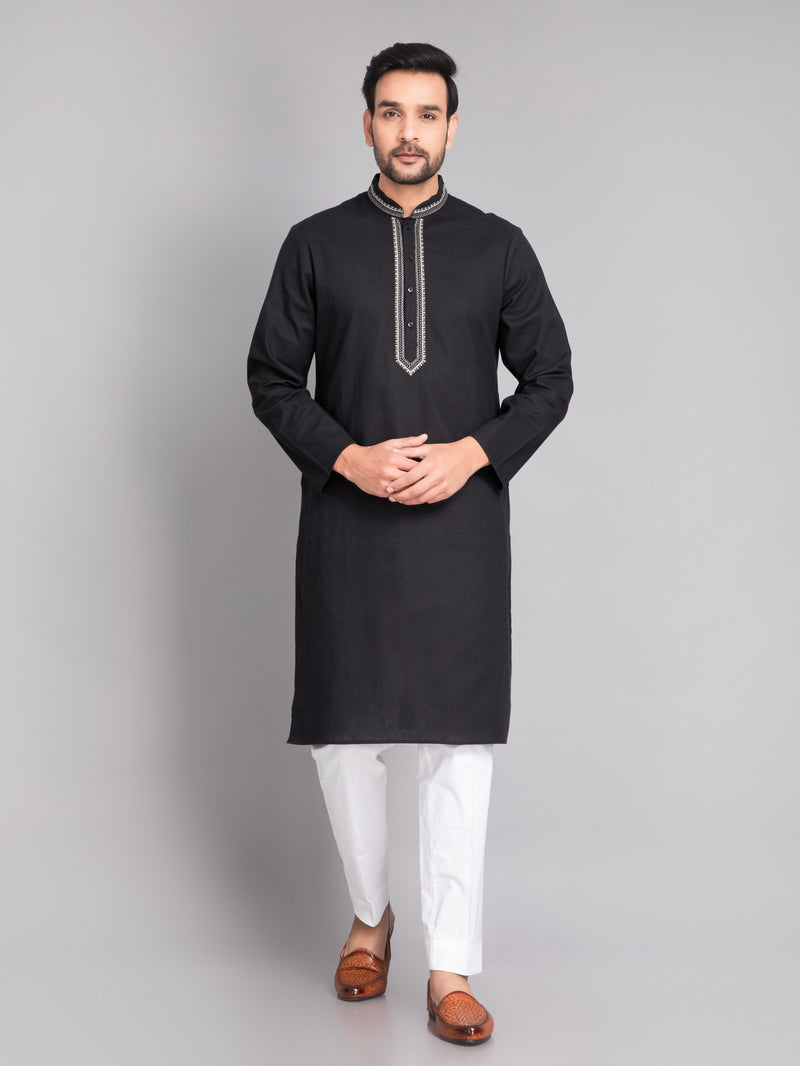SUTI MEN'S BLACK COTTON LINEN EMBROIDERED KURTA