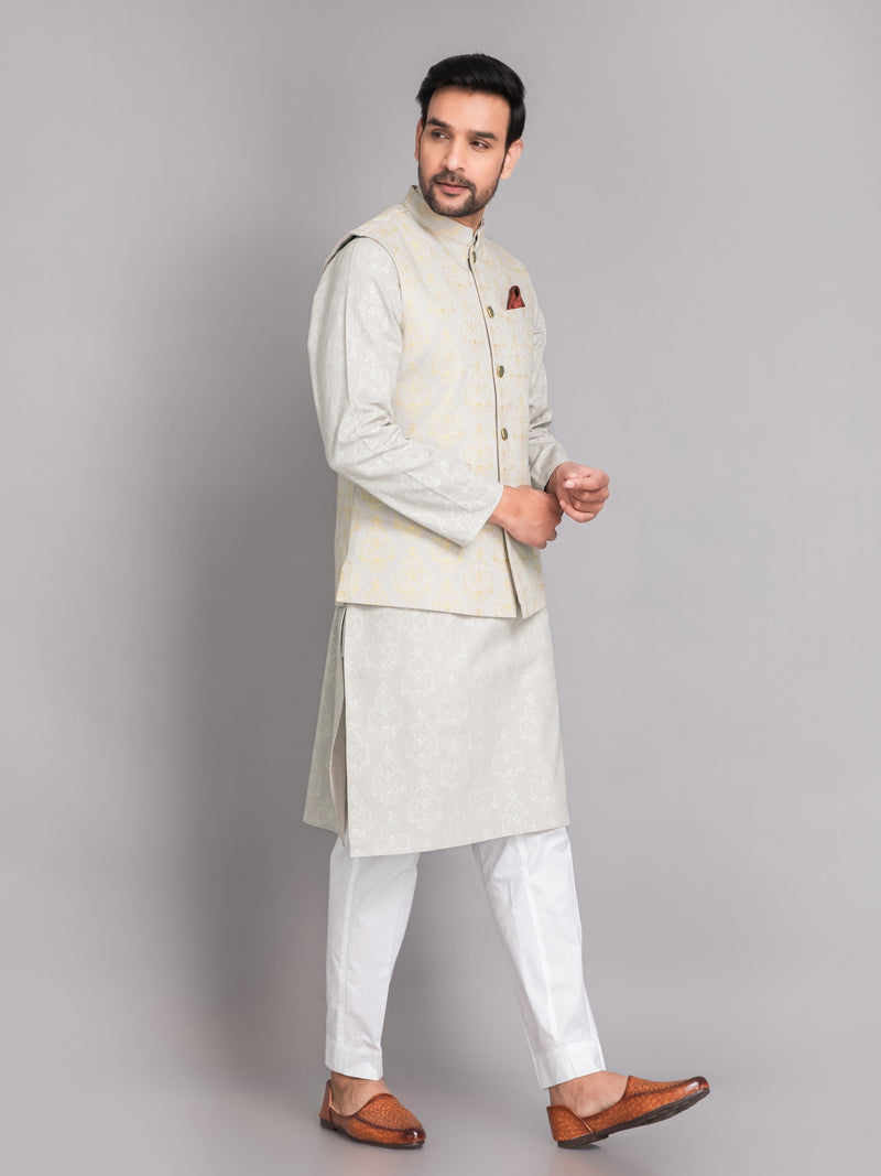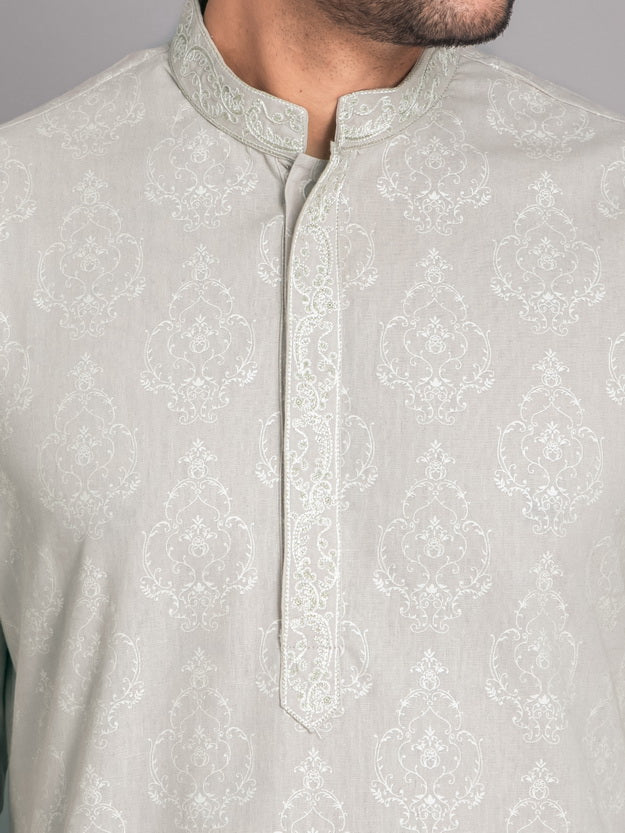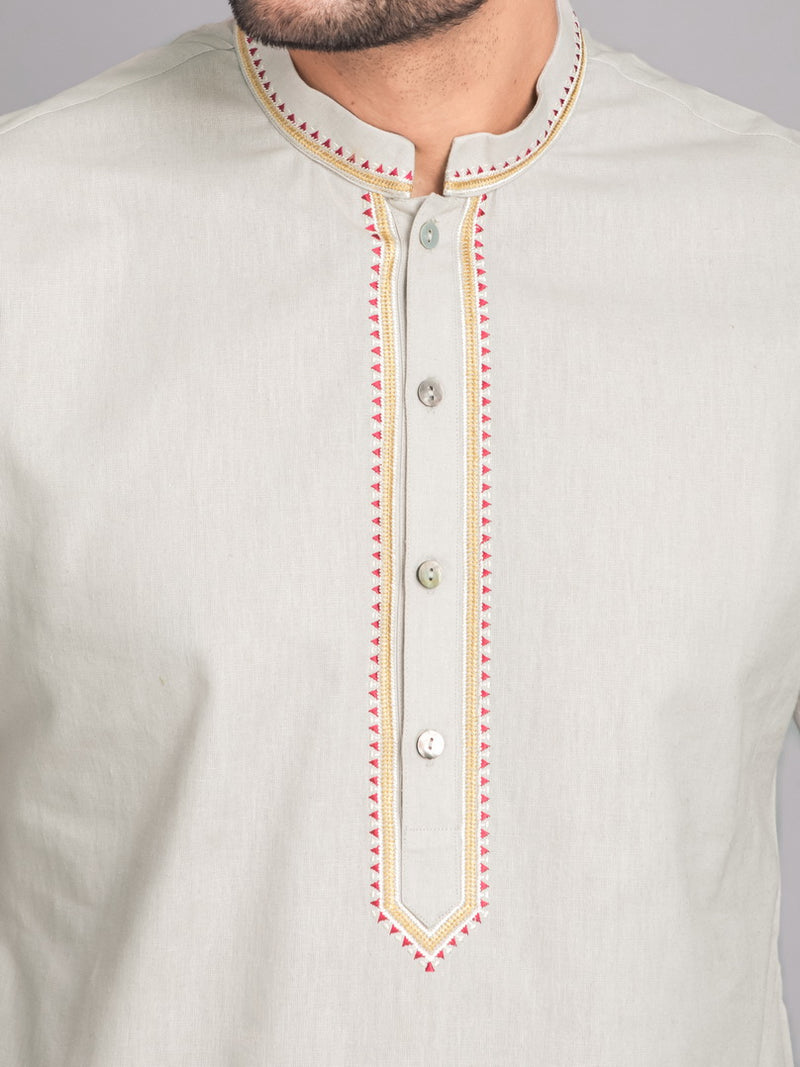 SUTI MEN'S KHADI LINEN LIGHT GRAY PRINTED EMBROIDERED NECK LINE KURTA