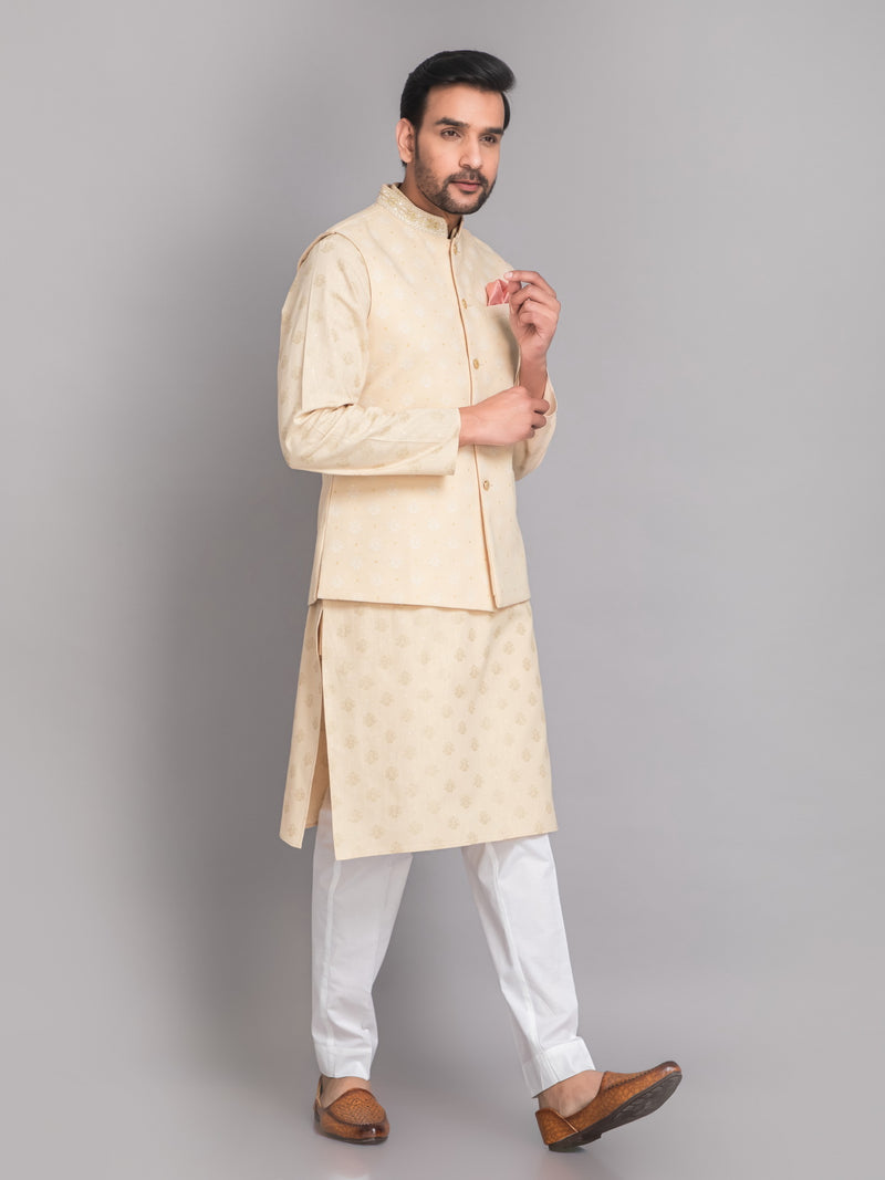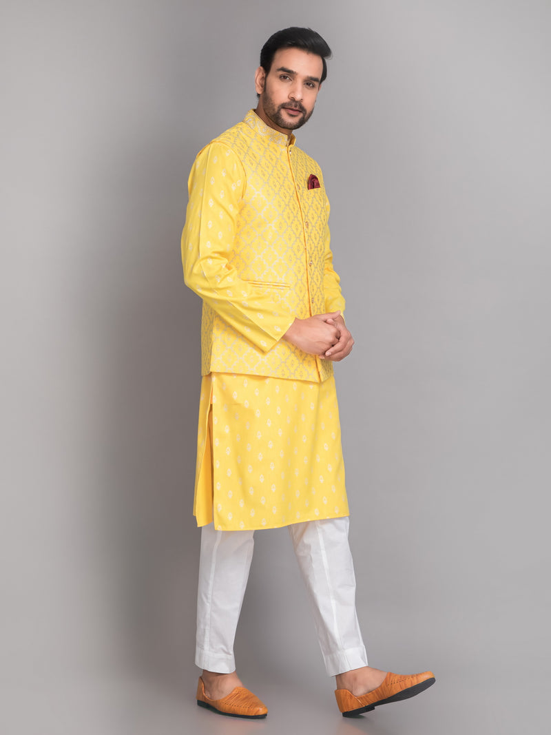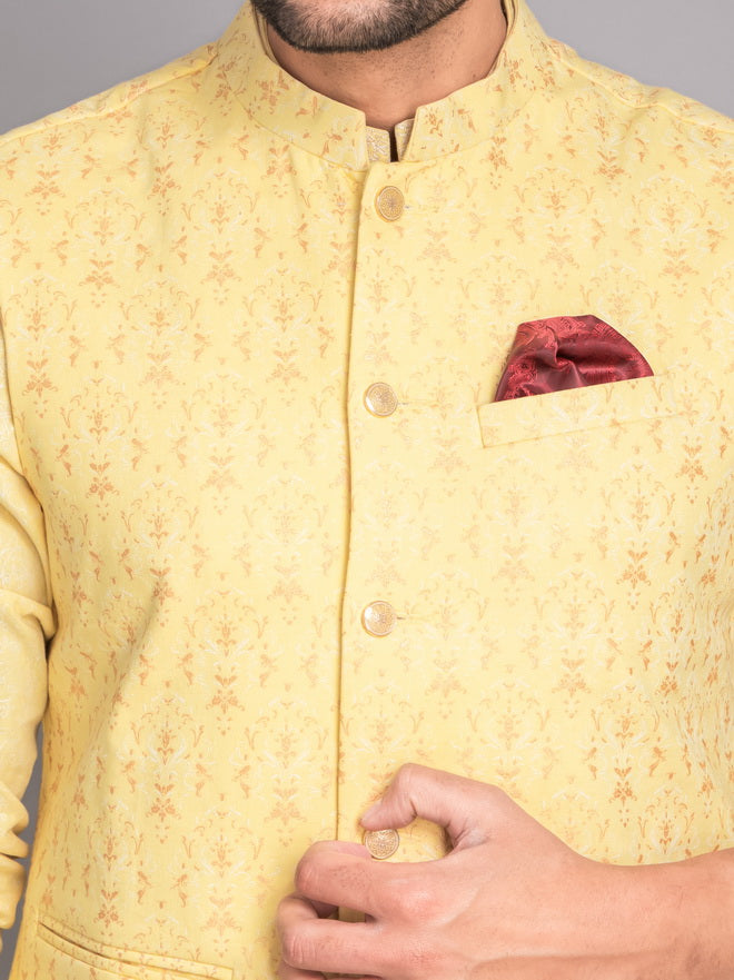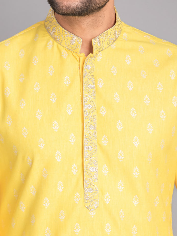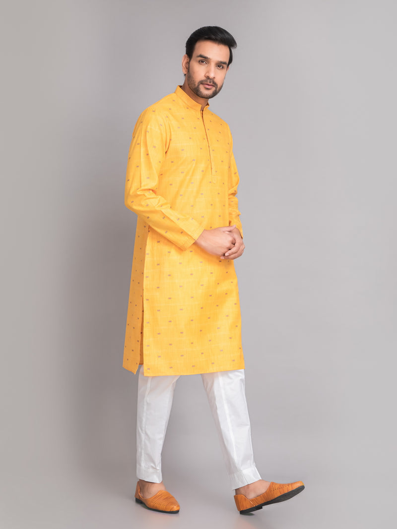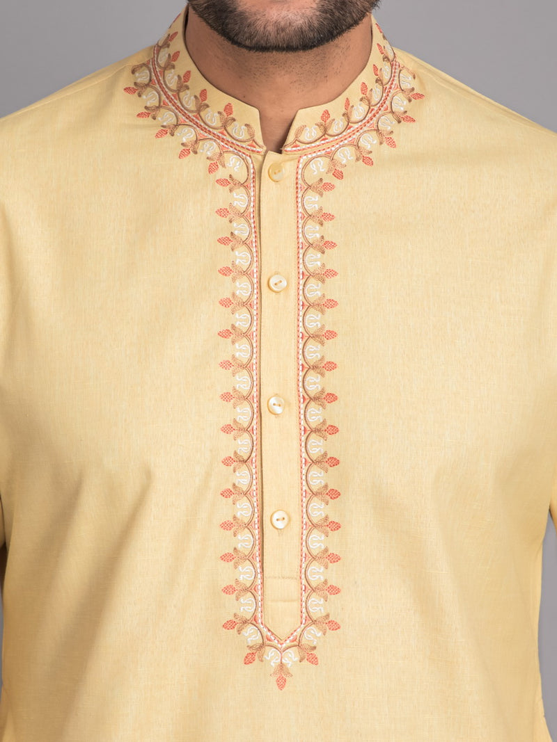 SUTI MEN'S GOLDEN YELLOW CHAMBRY JACQUARD NECKLINE EMBROIDERED LONG KURTA