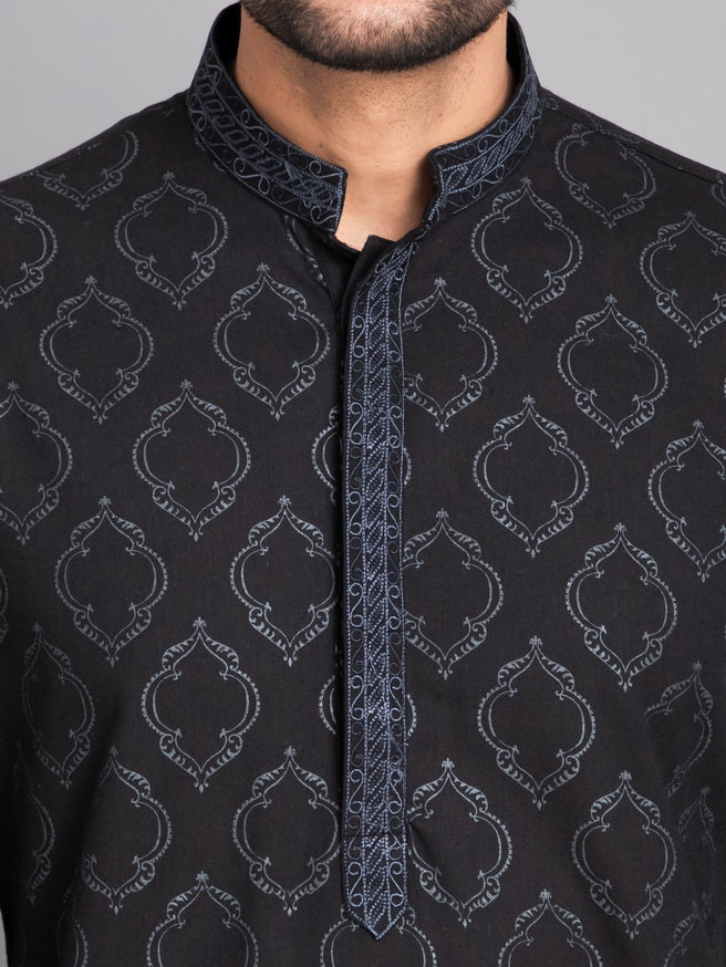 SUTI MEN'S CHAMBRAY PRINTED LONG KURTA EMBELLISHED WITH ZARI EMBROIDERY