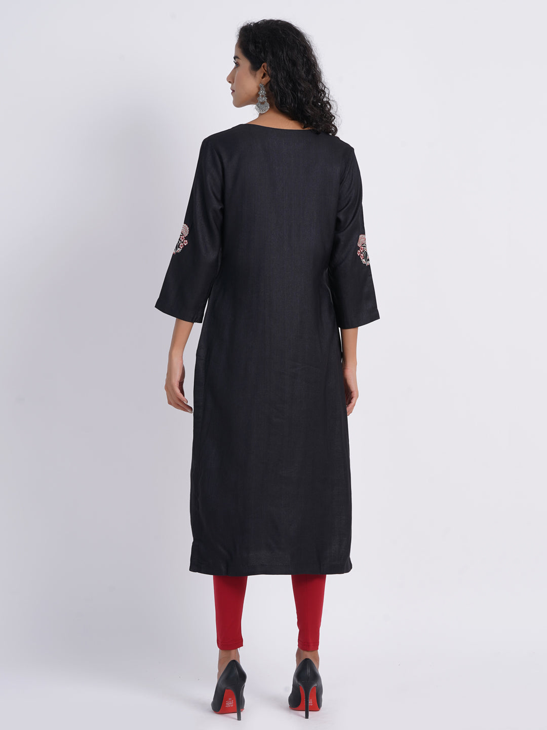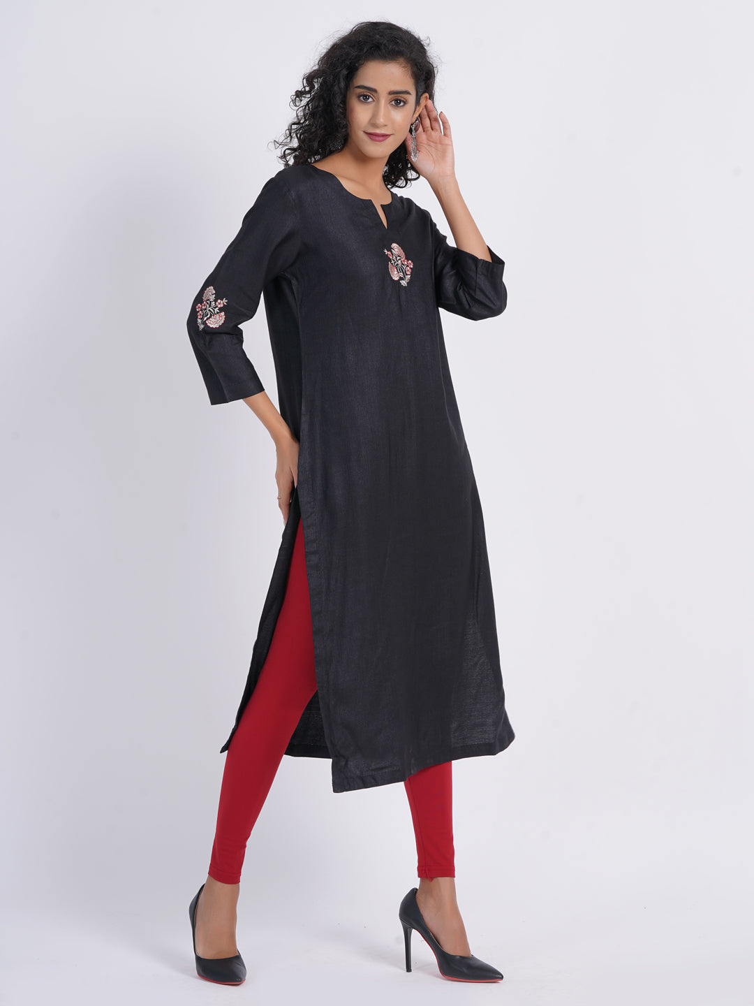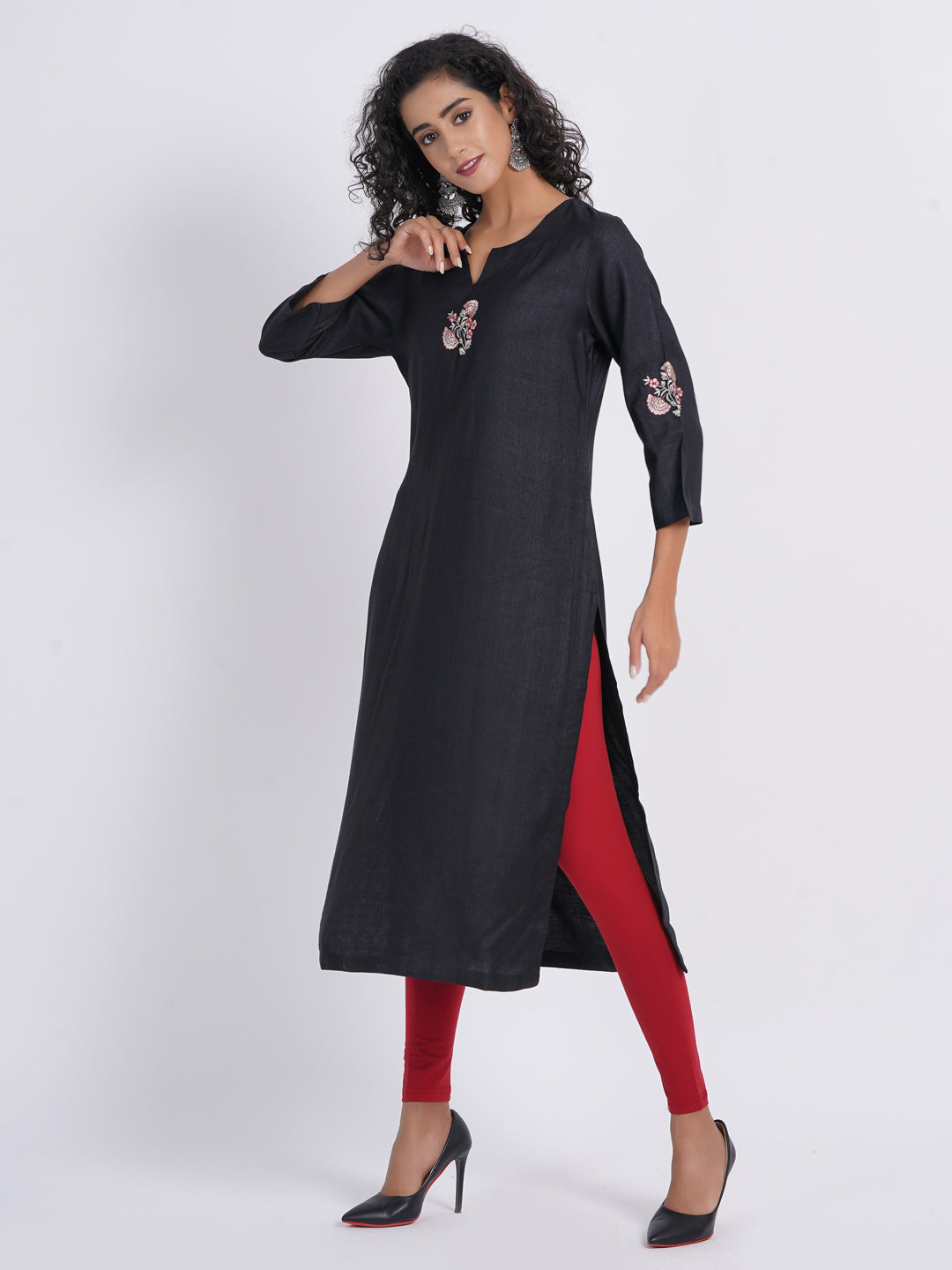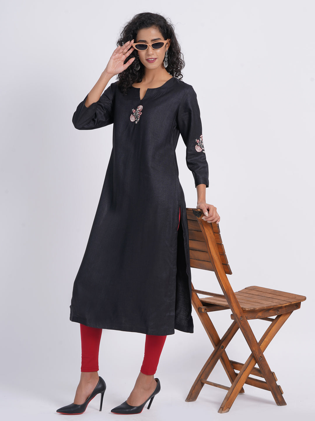 Crafted from opulent tussar silk, this kurta promises both unparalleled elegance and supreme comfort. Features a timeless round neckline with a stylish V-cut for a modern twist, lavishly adorned with exquisite embroidery motif for a touch of grandeur. Classic 3/4 sleeves with motif embroidery placement, adding a refined and sophisticated edge. The straight silhouette enhances your graceful stature with effortless sophistication.