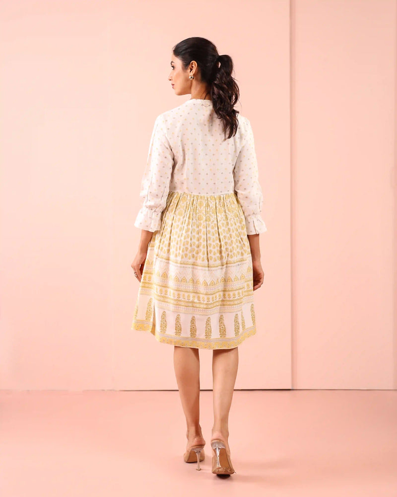 Flared Gold Printed A-Line Long Dress