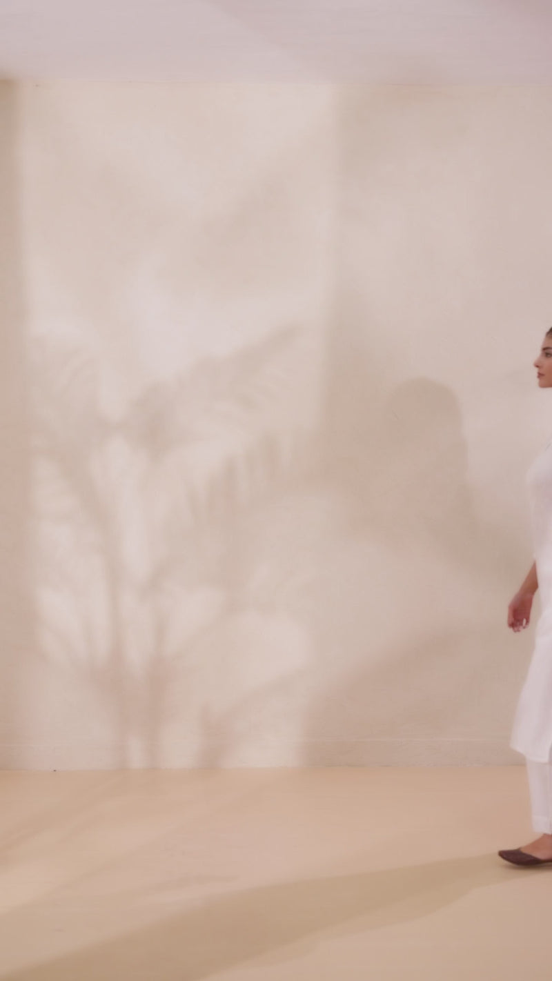 Designed for effortless sohistication, this white rayon dobby kurti with modest tonal chikankari embroidery on necklineand sleeves. The straight kurta is styled with round necklineand 3/4th sleeves, side slits for grance and elegance great for office, casual wears.