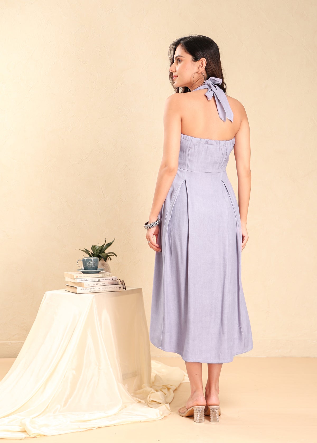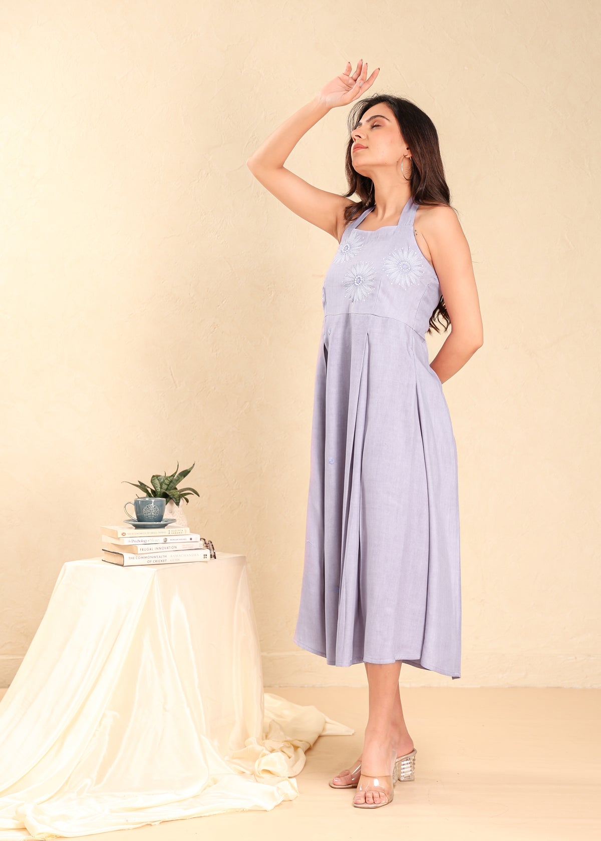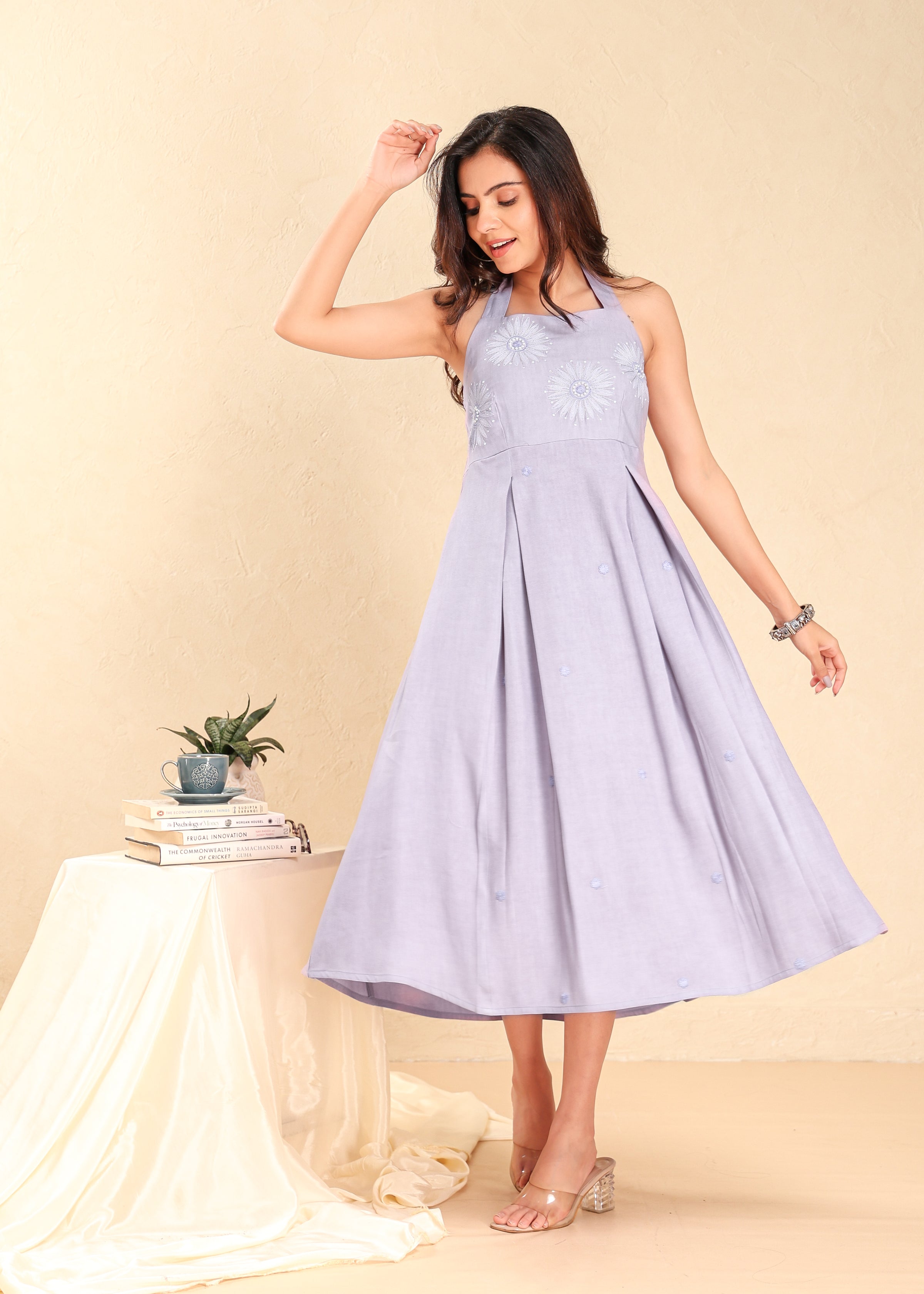 Elegant flared dress crafted from soft twill fabric, featuring delicate floral dori embroidery on the yoke. Designed with stylish tie-up halter straps and front box pleat detailing, it offers a graceful silhouette. Perfect for summer days, casual outings, or relaxed daytime occasions, combining comfort with effortless elegance.