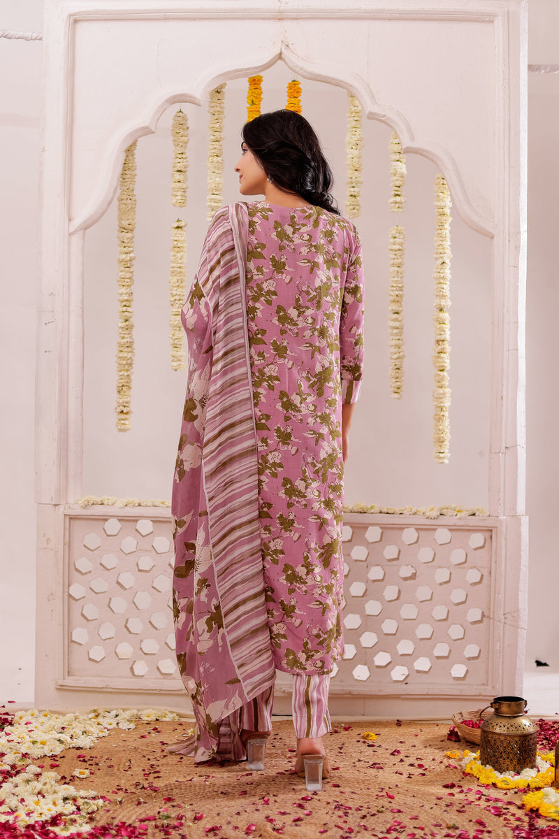 Women Almond Color floral-printed-3pc-flared-kurta-set-embellished-with-hand-craft-details